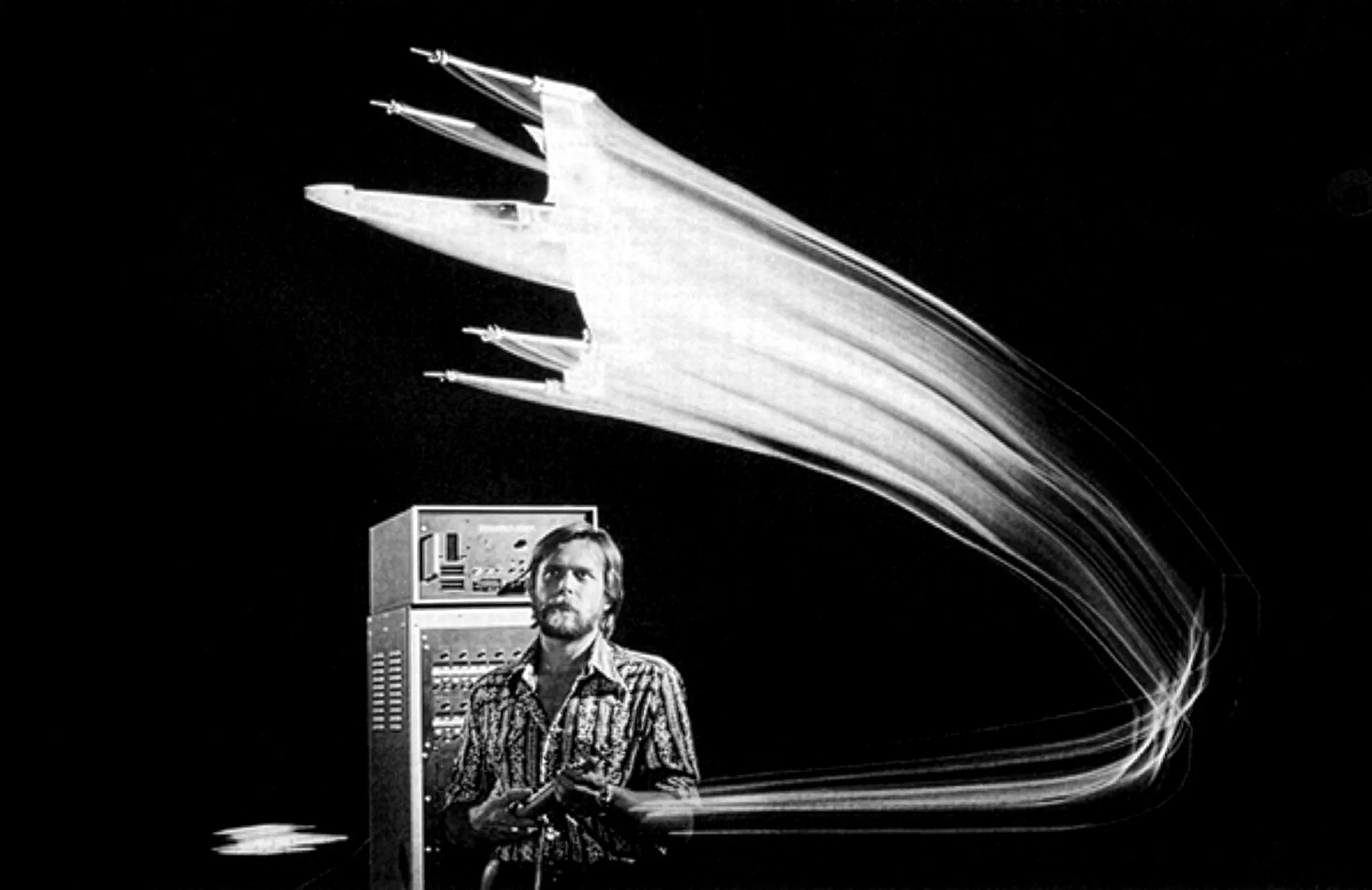 John Dykstra in an undated double-exposure showing part of the PDP-11 motion-control system and an X-wing fighter model manipulated by a motion-control arm.