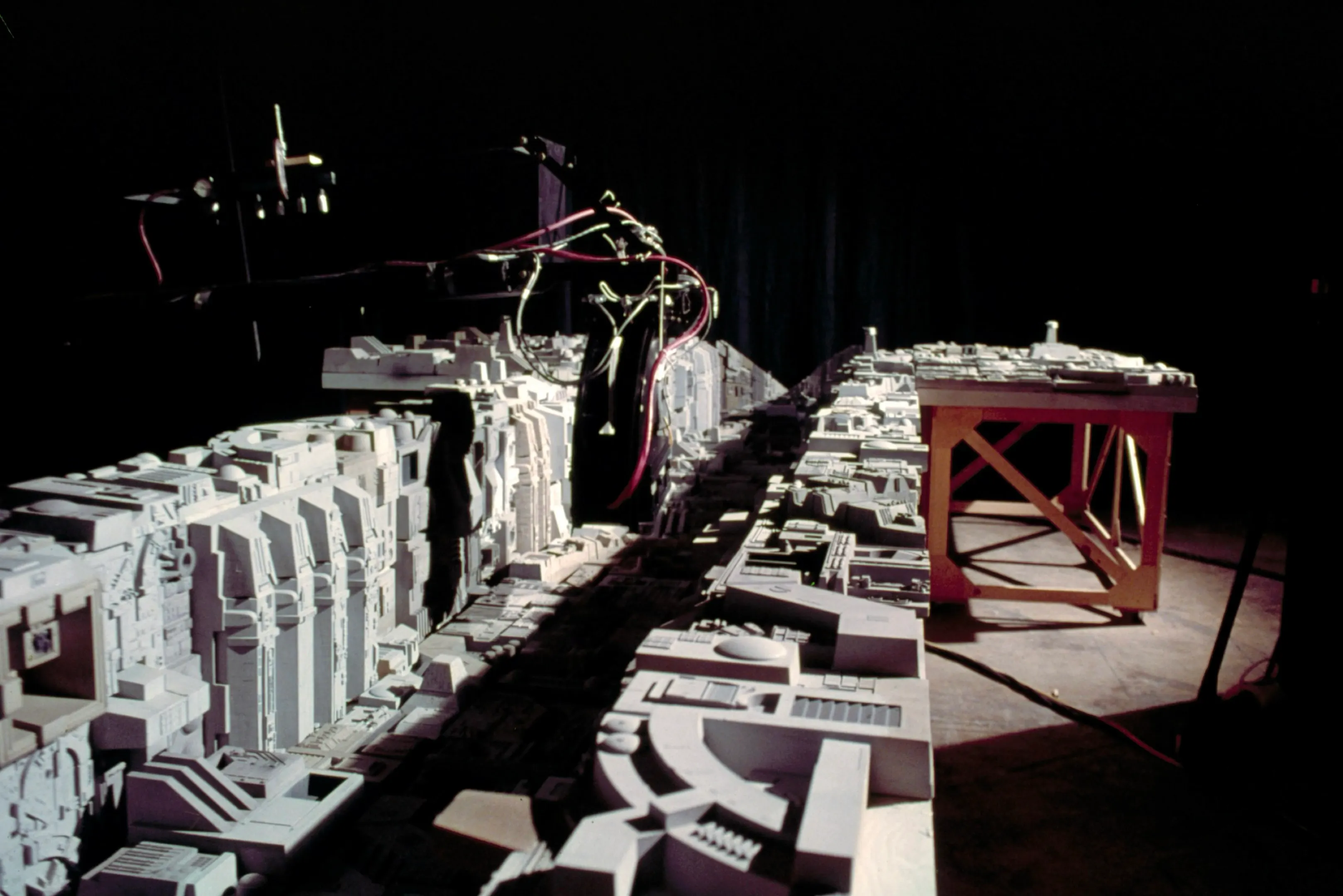 A view of the Dykstraflex system filming the Death Star Trench scene, itself based on the 1955 Film Dambusters, which used a combination of archival and then-new airplane footage.