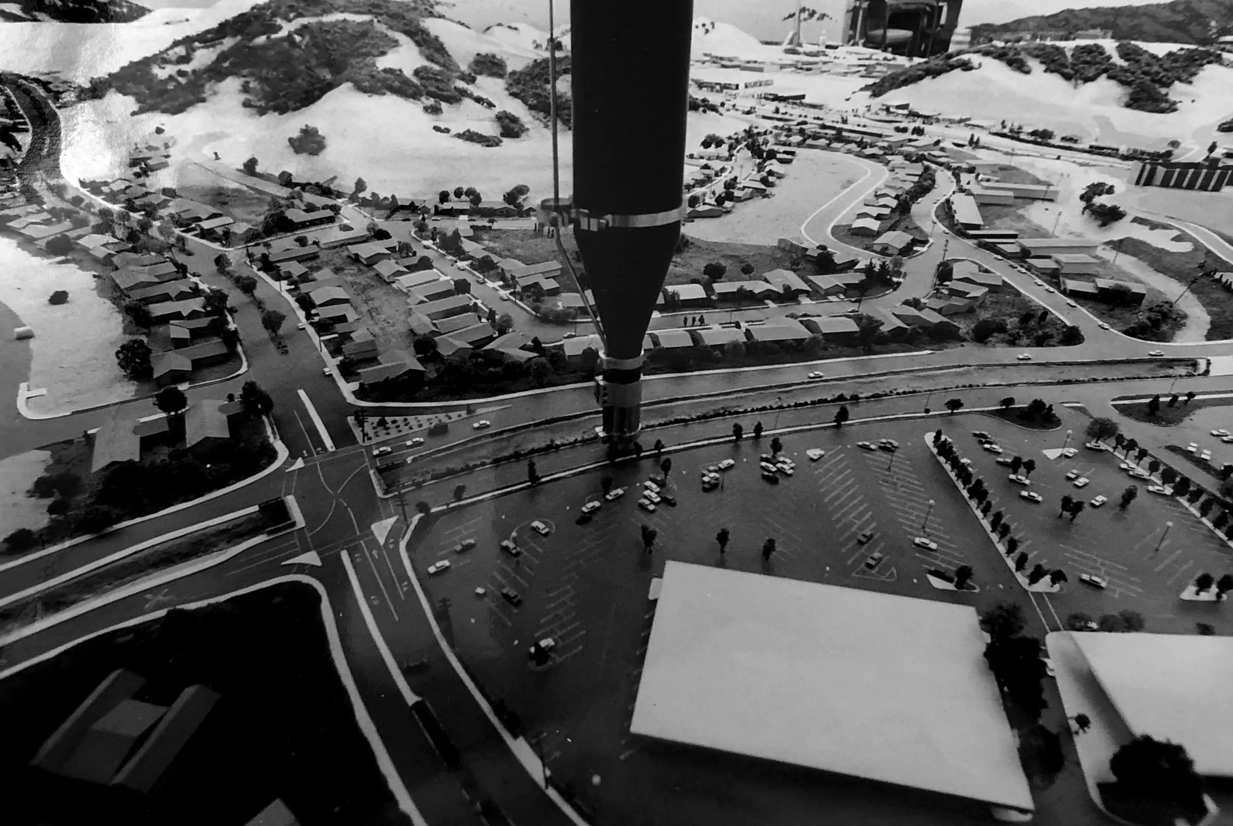 The roadway and its adjoining buildings had been built two years previously. They formed part of an elaborate model of two square miles of Marin County at 1"=40'0" scale. While sheltered in an architecture school, the model’s precision and materials resembled a model train set, with the “emphasis on foreground detail” (Institute for Urban and Regional Development 1975). Tiny model cars populated the curbside; signs from supermarkets and gas stations were photo-etched in thin, colored plexiglass. And around the horizon, slopes of sawdust stood in for the sun-bleached grasses of the Marin headlands.