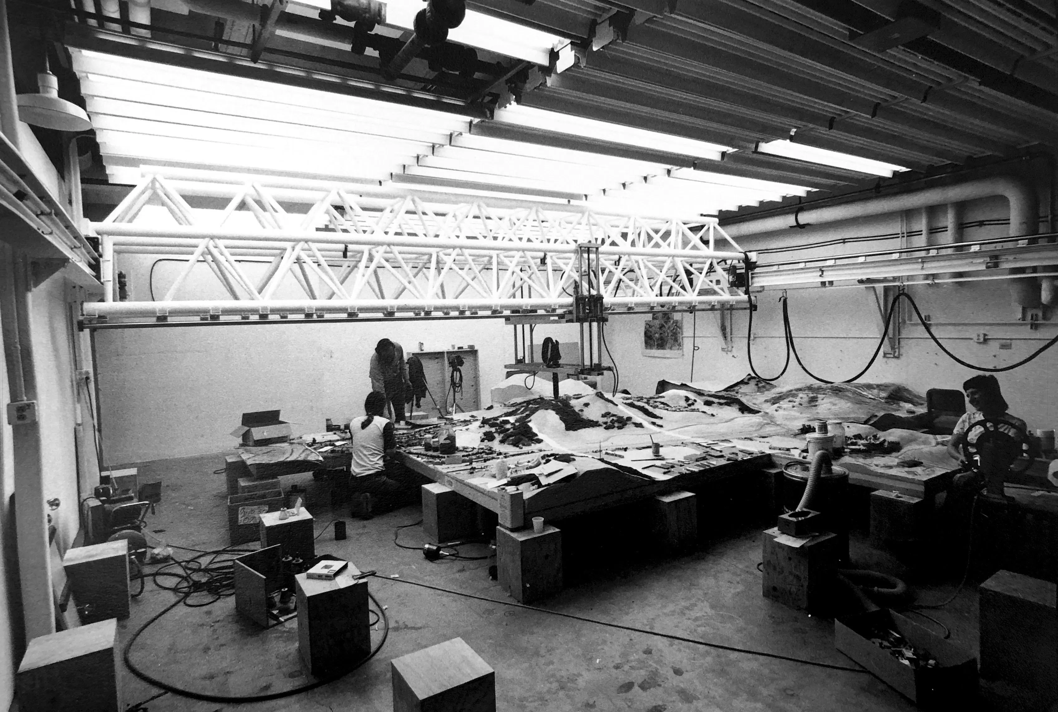 An overall view of the Berkeley Environmental Simulation Lab (BESL) Showing a complete overhead gantry and a partially constructed model of Marin County, c. 1972. Donald Appleyard Collection (DAC) Bancroft Library, University of California