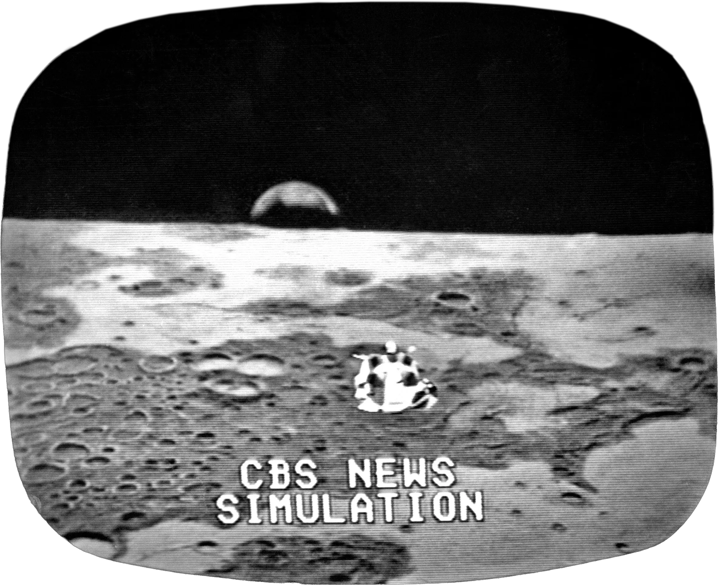 This myopia had two consequences. First, while there is no inherent technical reason that a high-resolution color TV image could not be transmitted from the moon, the images viewed by millions on earth were grainy and ghostlike, produced on special, low-resolution, low-framerate cameras developed by the Radio Corporation of America (RCA) and Westinghouse; only the black-and-white RCA version was ready for Apollo 11. Second, CBS’ production team was so unconvinced by the visual quality of broadcast graphics provided by NASA’s press office, they decided it needed to be prepared to “go it alone” and prepare their own simulated visuals for the TV broadcast of Apollo—where “going it alone” ironically required commissioning NASA’s own technical suppliers of simulator content.▶16