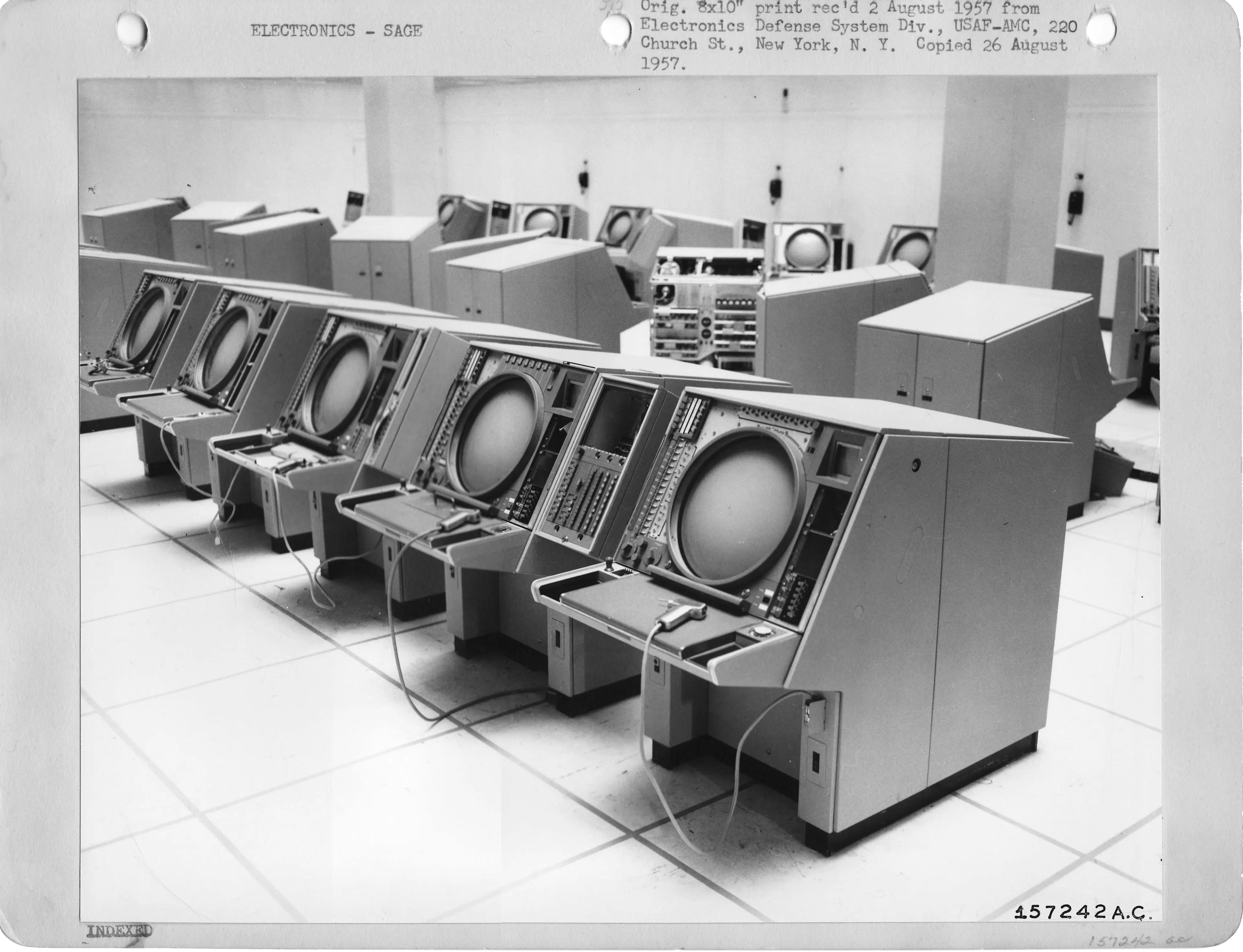 Deployed at twenty-three sites across North America from the 1950s to the 1980s, SAGE was built to protect the United States against airborne attack by Soviet bombers. Each installation interpreted radar signals from across a large sector of the United States to create a digital map of moving aircraft and sort and identify potential hostile aircraft. Through its digital interface, SAGE operators interacted with this digital model of the airspace and could deploy surface-to-air defenses against any potential target. Initially, these commands traveled by automated teleprinters to surface-to-air missile batteries; later in the system, the launch systems were fully connected to SAGE’s consoles.