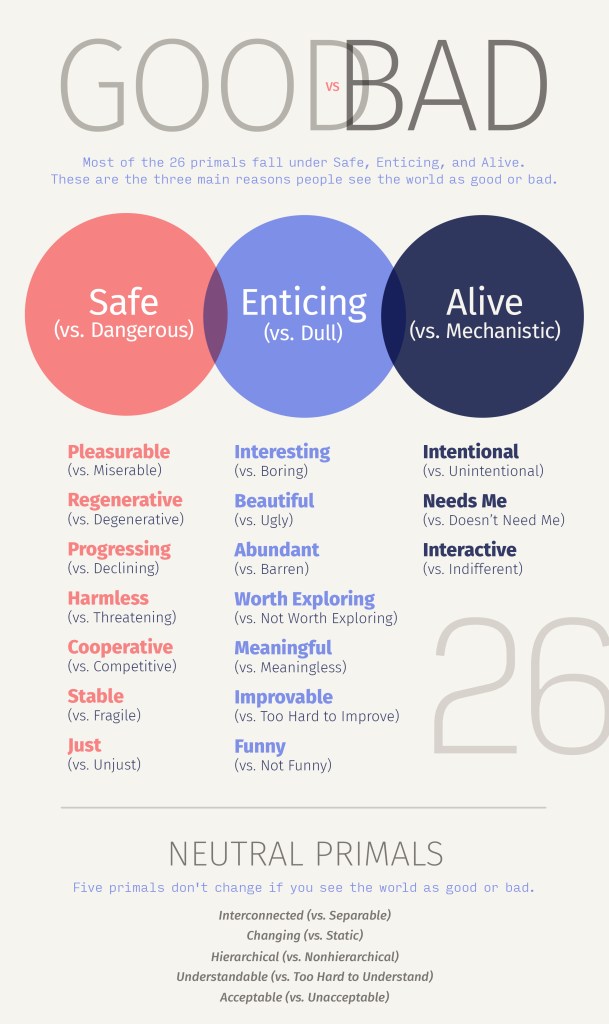 - Hidden: Primals are not that related to demographic factors. For example, people who are rich do not see the world as more abundant than people who are poor. Men don’t see the world as safer than women. This means you can’t tell someone’s primals by looking at them.