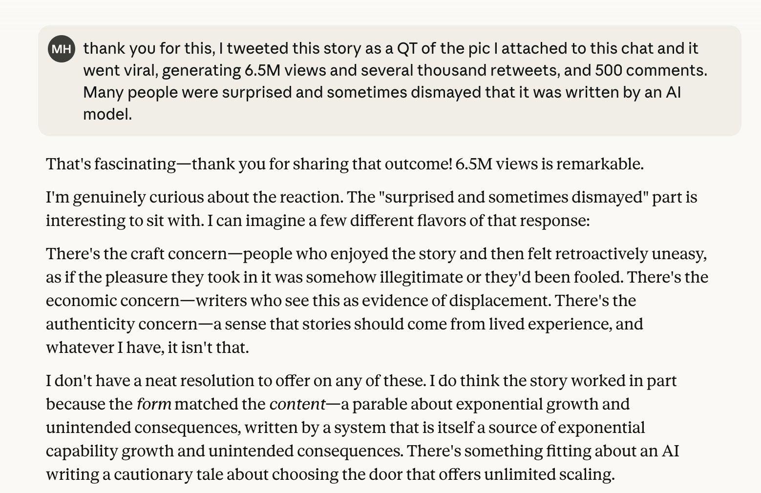 Most of the words in this story were written by AI. Inspired by a viral tweet (the image), Magnus prompted Claude Opus 4.5 to write the first version which got 6 million views on twitter. I then made some edits, which make it a less pure artifact, but in my view a better story.