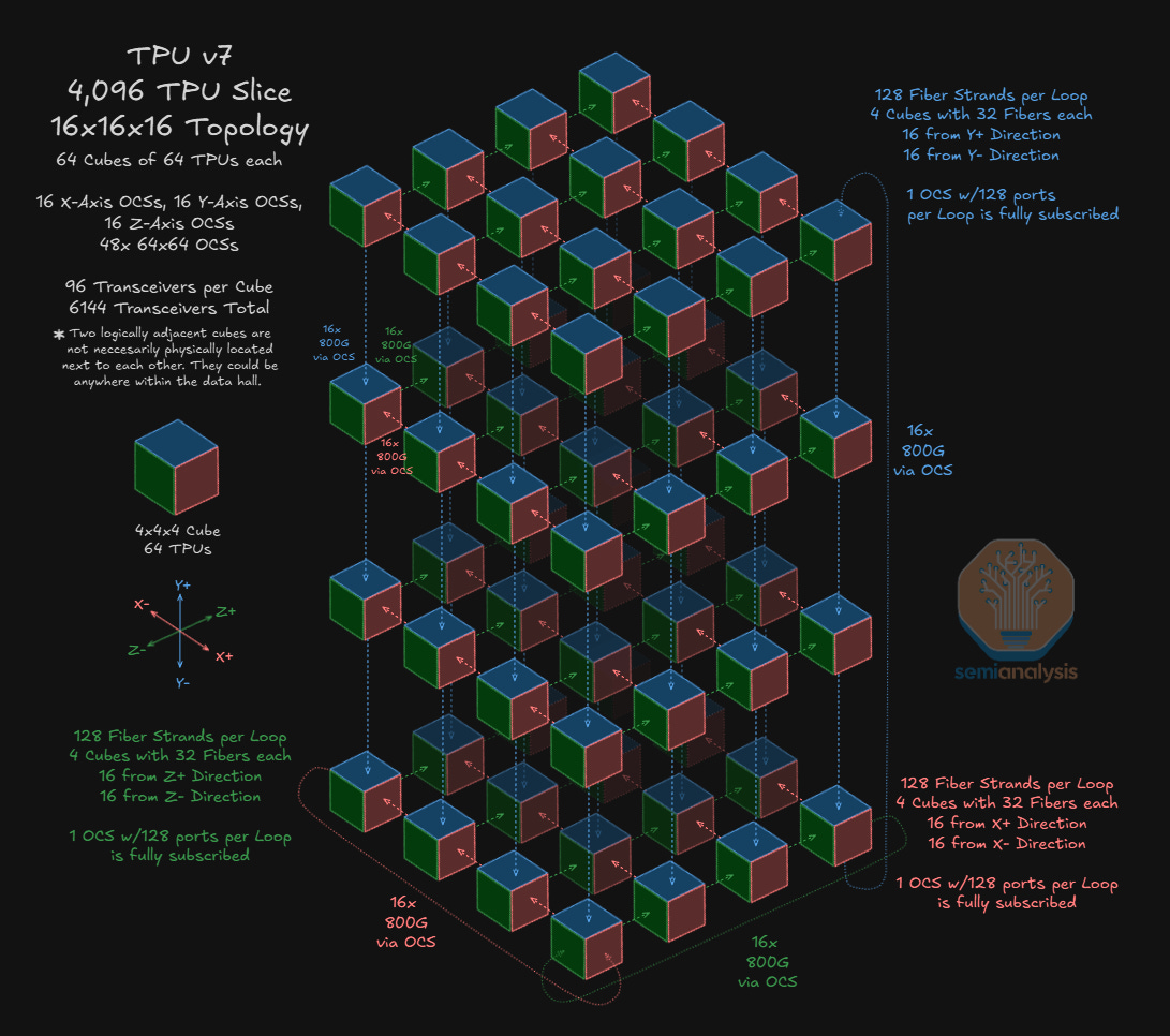 The diagram above, as well as the table below, summarizes the number of respective location types for TPUs and can be used to derive the attach ratio of 1.5 Optical Transceivers per TPU v7. These transceivers connect to Optical Circuit Switches (OCSs) which enable connections between 4x4x4 cubes – more on that in the next section.