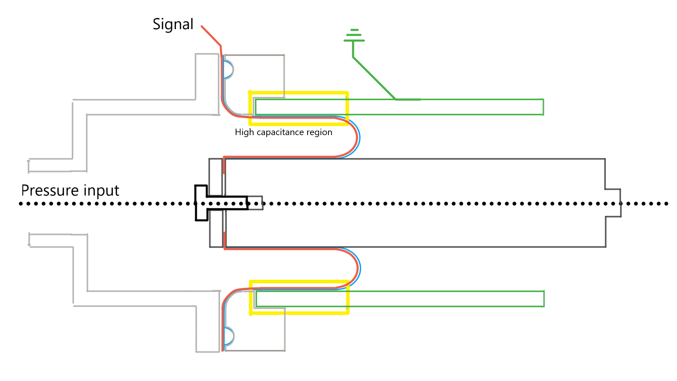 The capacitance between two conductive surfaces is proportional to area divided by gap distance. In the "high capacitance region" highlighted in yellow, the diaphragm is pressed against the outer bore by the pressure so the gap distance is ~0. To keep exposed fibers on the surface of my poorly cast rubber diaphragm from actually touching the aluminum, I put a layer of 0.03 mm thick kapton tape (not pictured, sorry) over the entire inner surface of my aluminum tube. The clearance between the two bores was something like 5 mm, so a given patch of area on the diaphragm contributes ~150x more capacitance when it's pressed against the outer bore than when it has rolled onto the inner one. The capacitance is also decently large: for a 20mm bore diameter it's about 60 picofarad per millimeter with kapton as the dielectric, and bigger pistons give bigger capacitance signals.