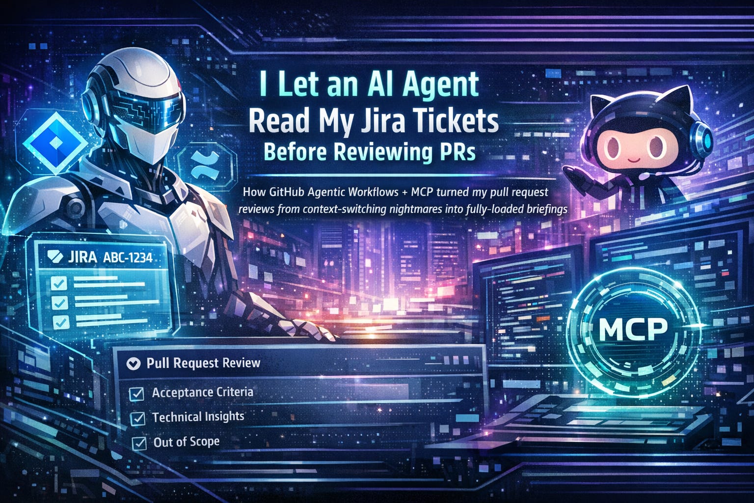 The agent triggers on PR open or when a draft is marked ready for review, extracts Jira keys from the branch name or description (most teams already use feat/ABC-1234-short-description naming conventions), fetches all the relevant context, and posts a structured comment.