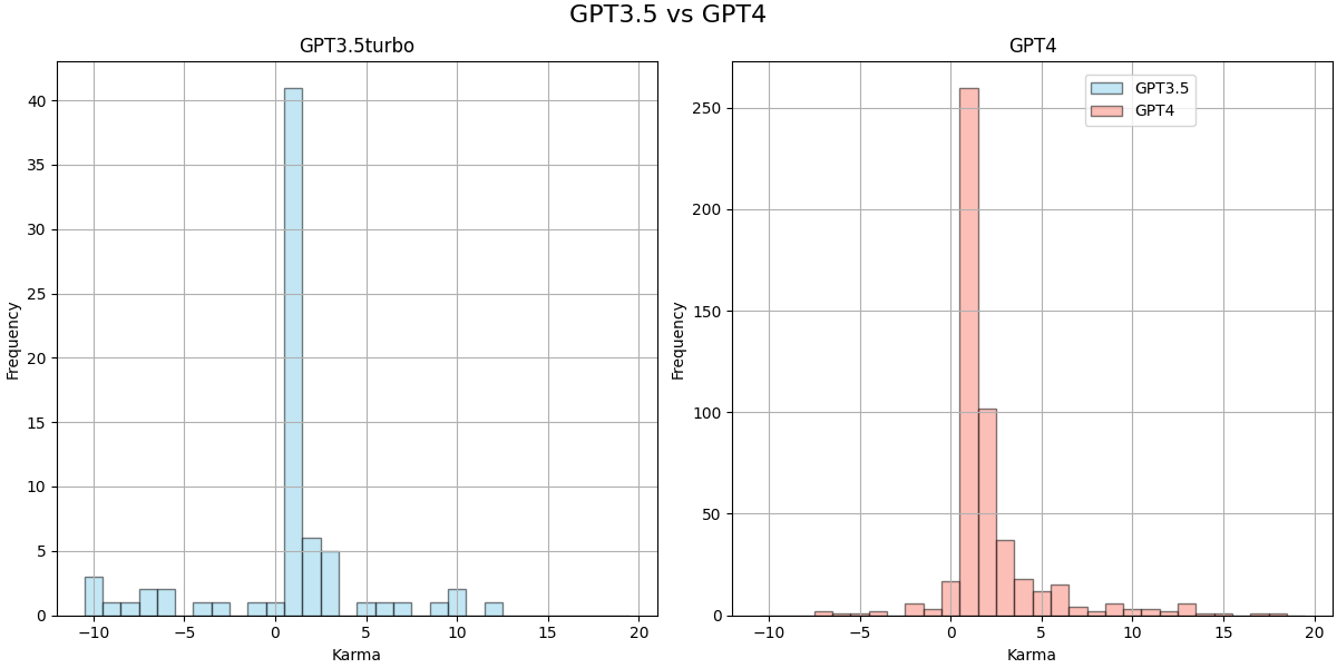 GPT-4 seemed to pick up the context much better and to.. pay more attention to my prompts and be more creative in general? The view above only shows stats for comments that landed in the “[-10, 20]” karma range. Notably, GPT-4 produced numerous highly-rated comments that exceed the plot axis.