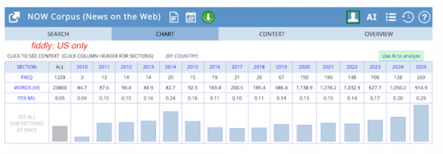 The OED defines it as “Requiring time or dexterity; pernickety” and has citations going back to 1926. Early uses were strictly British but it traveled to America by the 2000s and, as Lynne notes, I wrote about it on this blog in 2016., when a common phrase was “fiddly bits.” She observes that the News on the Web (NOW) corpus gives the impression that U.S. use had a bump in 2014, dropped off for a couple of years, and has been steadily increasing since then.