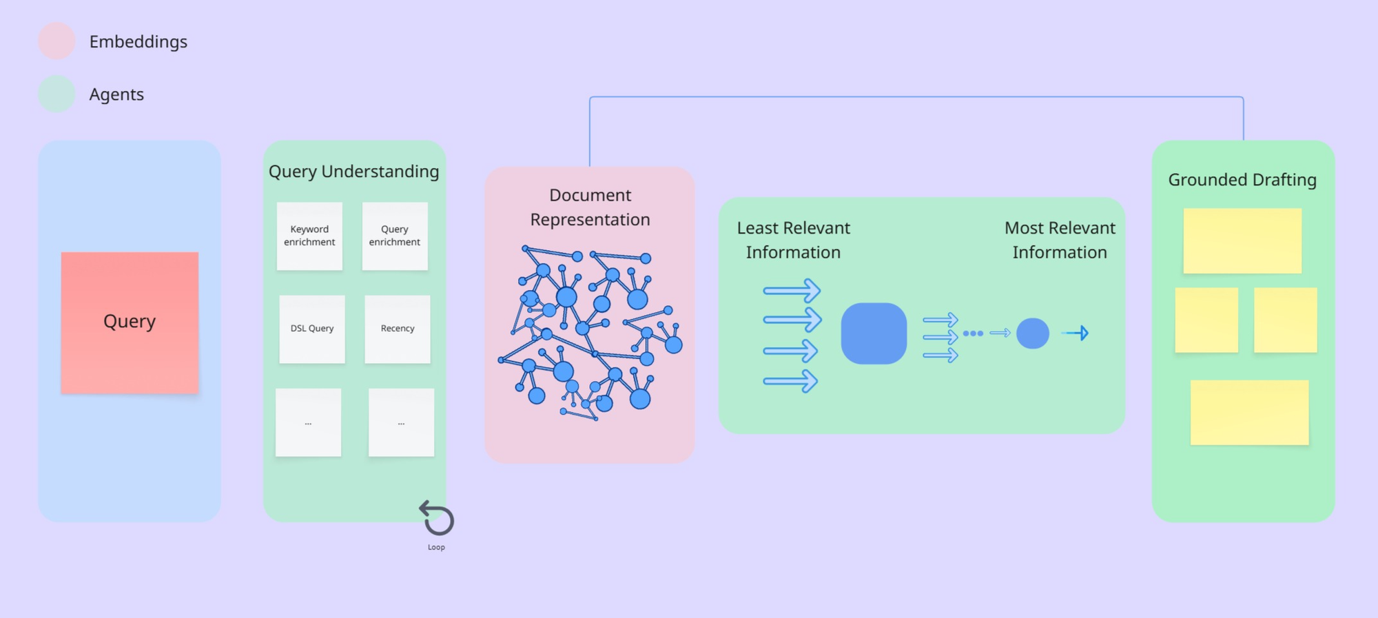As the set of data is processed, we have a structure that includes countless nodes (entities) and edges (connections), ready to be used for retrieving information. Once the user sends a query, after understanding it, we have multiple agents looking for relevant information simultaneously, looking into the nodes and their entities. Once these agents find the relevancy of the information, we distill the most relevant information, extracting the relevancy of the collected raw information, from the least relevant to the most relevant.