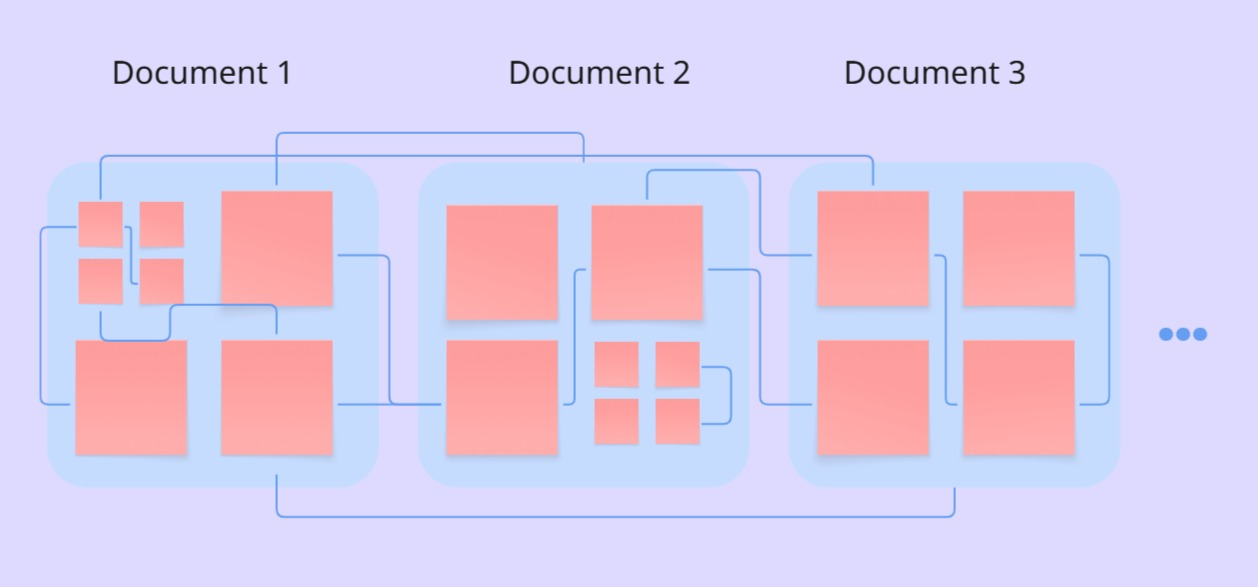 To build Nouswise's document preprocessing system, we constantly look for new relationships between the documents. It's done within a few steps and stages: 1. Each document has an outline (table of content-TOC) and sometimes each section has its own subsections, we process (embed) and store the tiniest body of the structure that carries an independent body of information as an entity. The combination of these tiny entities creates a bigger entity and going from within to without (from inside to outside) leads us to an entity for each document.