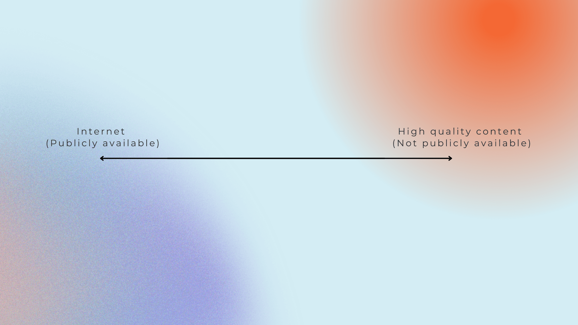 On the other hand, as for high quality contents, the main reason that they are not publicly available has been "copyright". The story of the copyright protected contents is a bit tricky. They're not usually accessible freely, they're not in a single place to use, i.e. they're fragmented in lots of small and big knowledge repositories within a specific vertical, and sometime very niche.