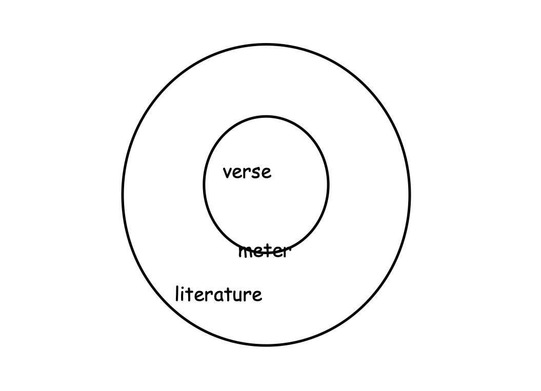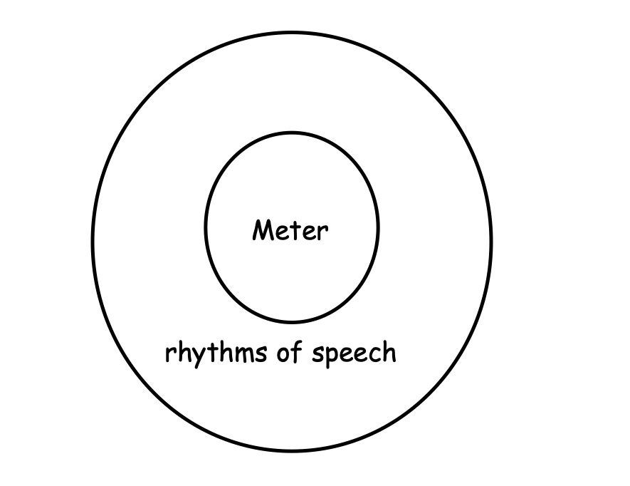 But not all patterns of speech are meter (ie, as we said earlier, “a consistent pattern of metrical feet”). When I talk to my Mom about my day, I’m not speaking in strict trochees or anapests. To put it in old-school logic textbook format: All [patterns of speech] are not [meter]. Therefore, meter is an example of the rhythm of speech, and rhythms of speech are an example of the rhythm of nature, but the converse statements are not true.