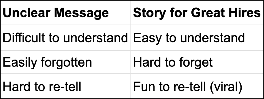 A story for great hires is easy to remember because it follows a logical pattern often seen in storytelling. Additionally, because it describes something valuable (a great organization looking for someone great to make an impact), it is a story people will be proud to share.