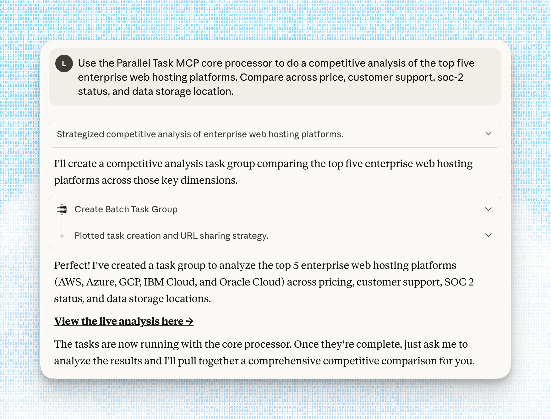 **For developers** building their own applications with the Parallel Task API, the MCP server can be a great way to quickly conduct testing, for example comparing the same prompt.