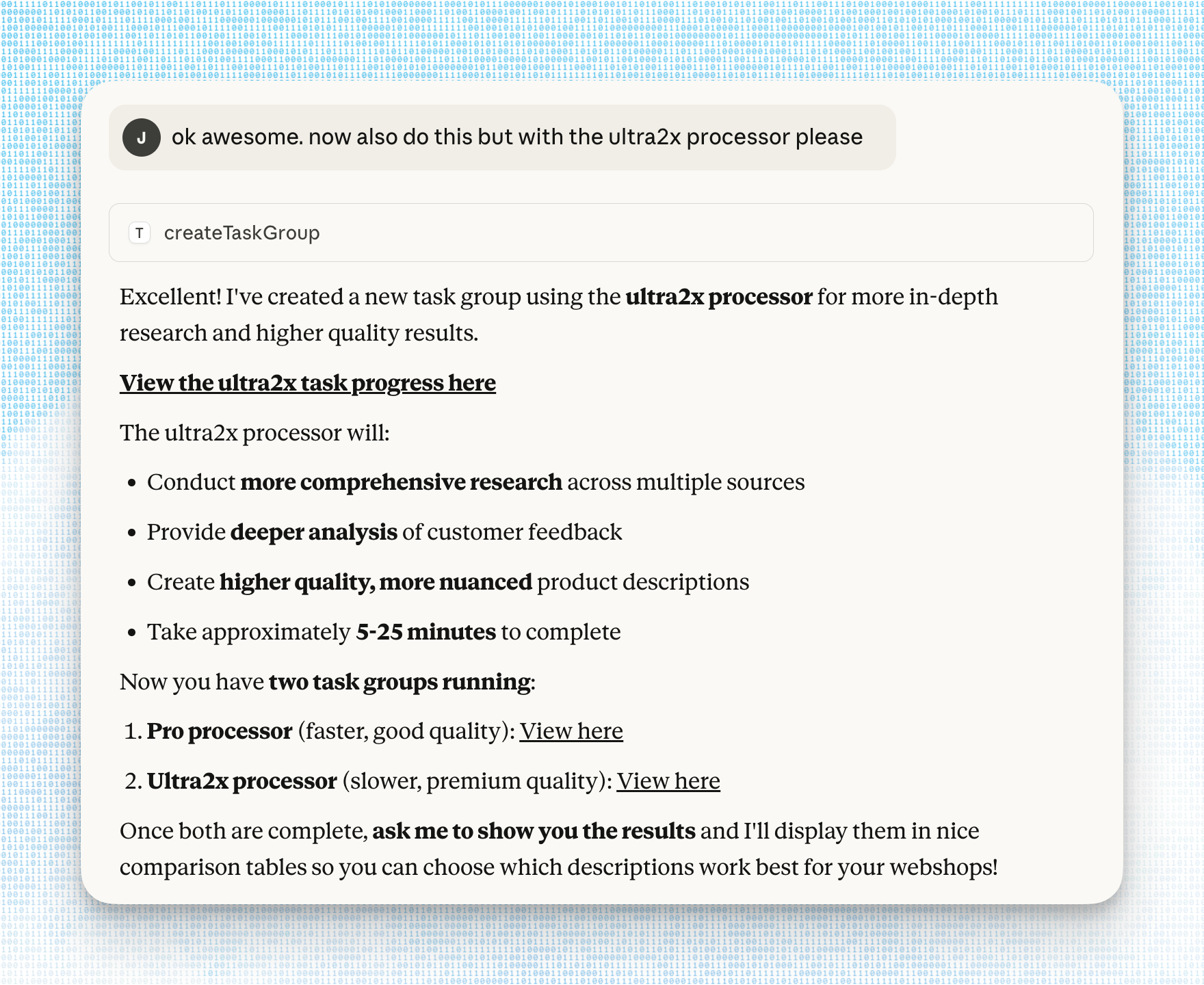 The Task MCP Server provides two core capabilities: deep research tasks that generate comprehensive reports, and enrichment tasks that transform existing datasets with web intelligence. Built on the same infrastructure that powers our Task API, it delivers the highest quality at every price point while eliminating complex integration work.