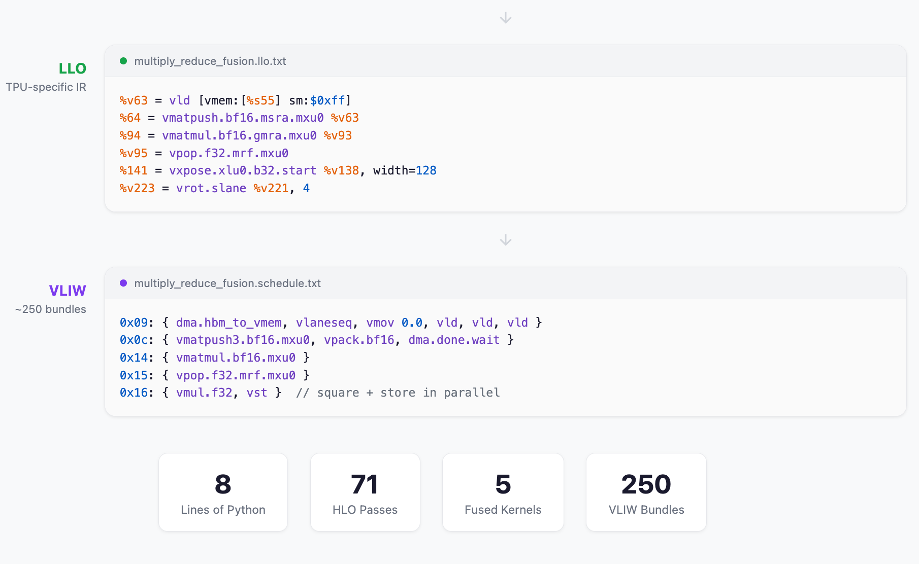 Eight lines of JAX code became 250 VLIW bundles across 5 fused kernels. Here’s what the compiler did to get there: