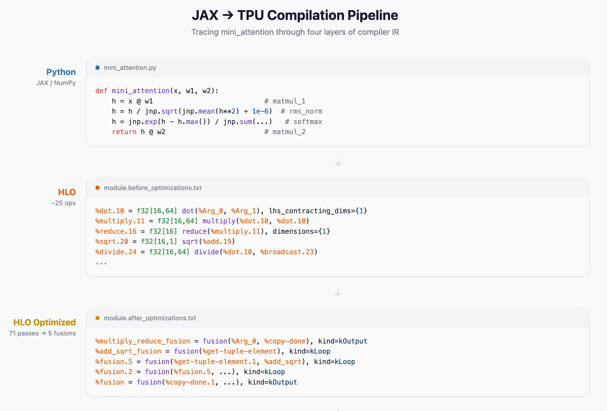 Whether you’re debugging why a custom op is slow, deciding between TPUs and GPUs for a new workload, or just curious what jax.jit actually does — this post traces the full compilation path with real IR dumps.