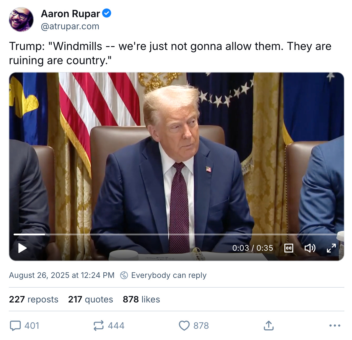 At this point The Crazy is running at such a rapid pace that hugely important stories all too often get buried because some other terrible thing pops up and demands immediate attention. So I ended up writing about Trump’s attempt to fire Lisa Cook before I could manage to write about how his hatred for wind power has metastasized into an effort to shut down 10 percent of U.S. electricity production — even as electricity prices are soaring.