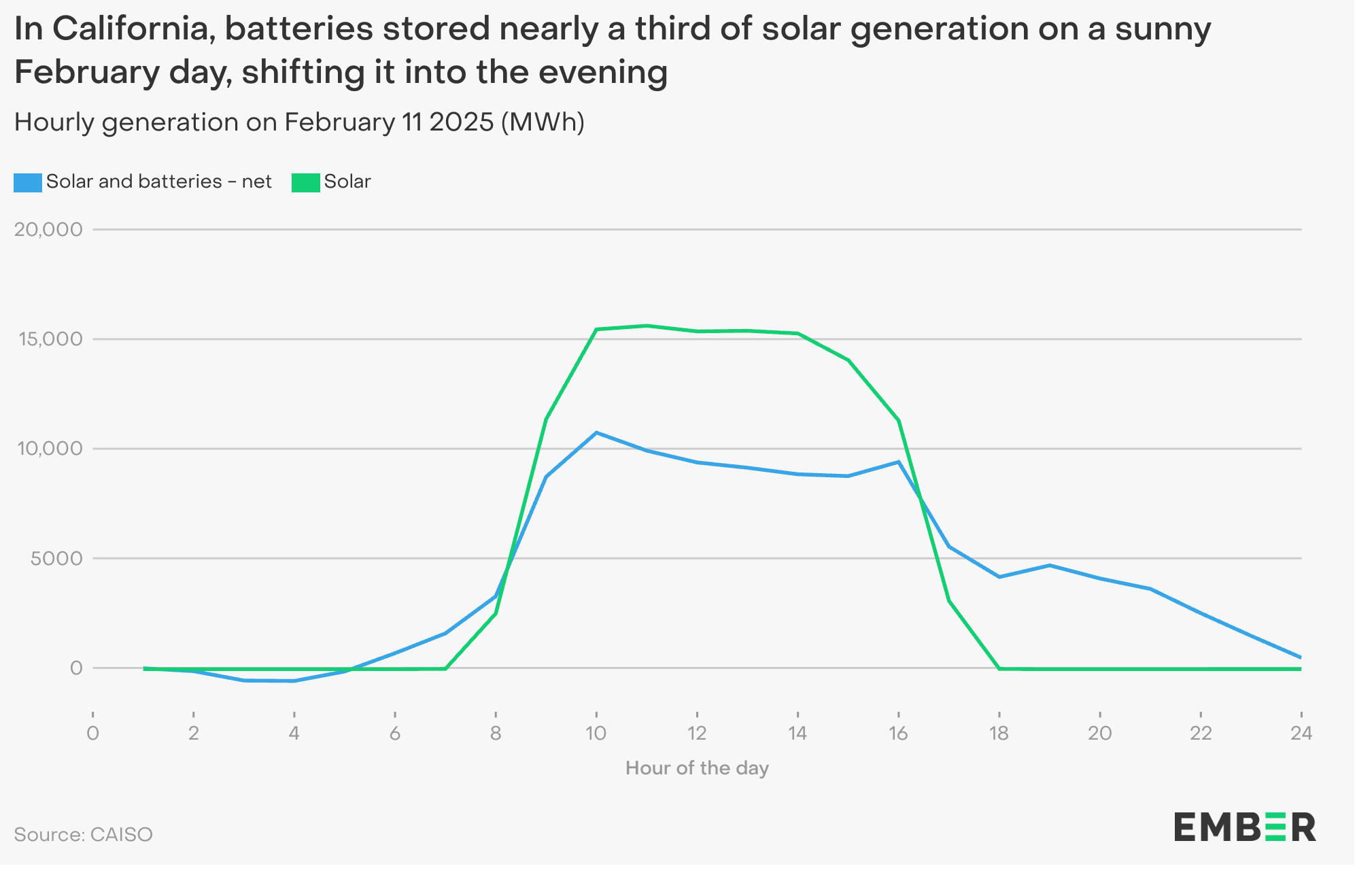 Batteries, in turn, work synergistically with solar power, making it possible to generate power when the sun shines and use it after dark. Here, for example, is what happened last February in California: