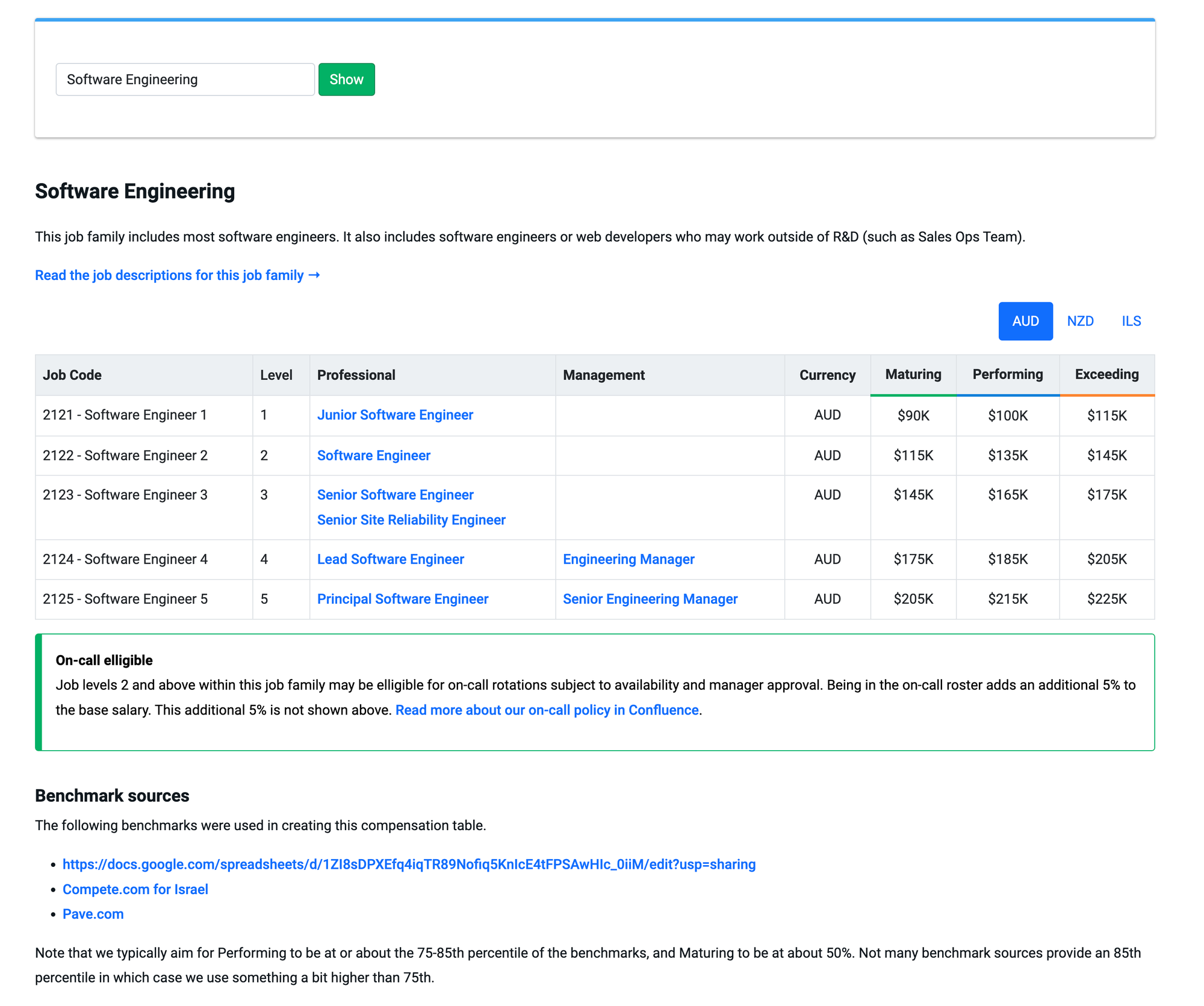 At the core of the system, there is an internal website that all Octonauts can use to view our salary tables. To make it concrete, here's what the actual page looks like for software engineering roles in Australia: