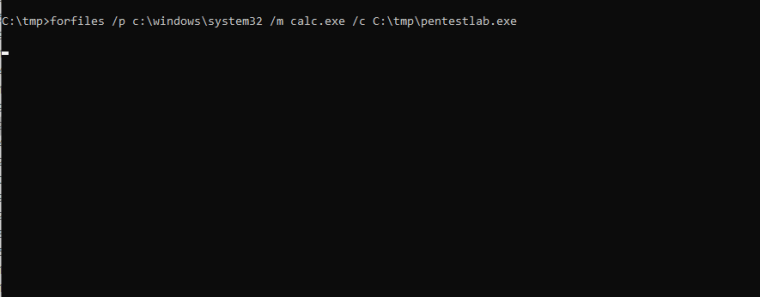 forfiles /p c:\windows\system32 /m calc.exe /c C:\tmp\pentestlab.exe