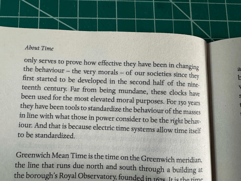 So wall-clock time — the time of schedules, meetings, train timetables — was already a technological imposition on older, bodily rhythms.