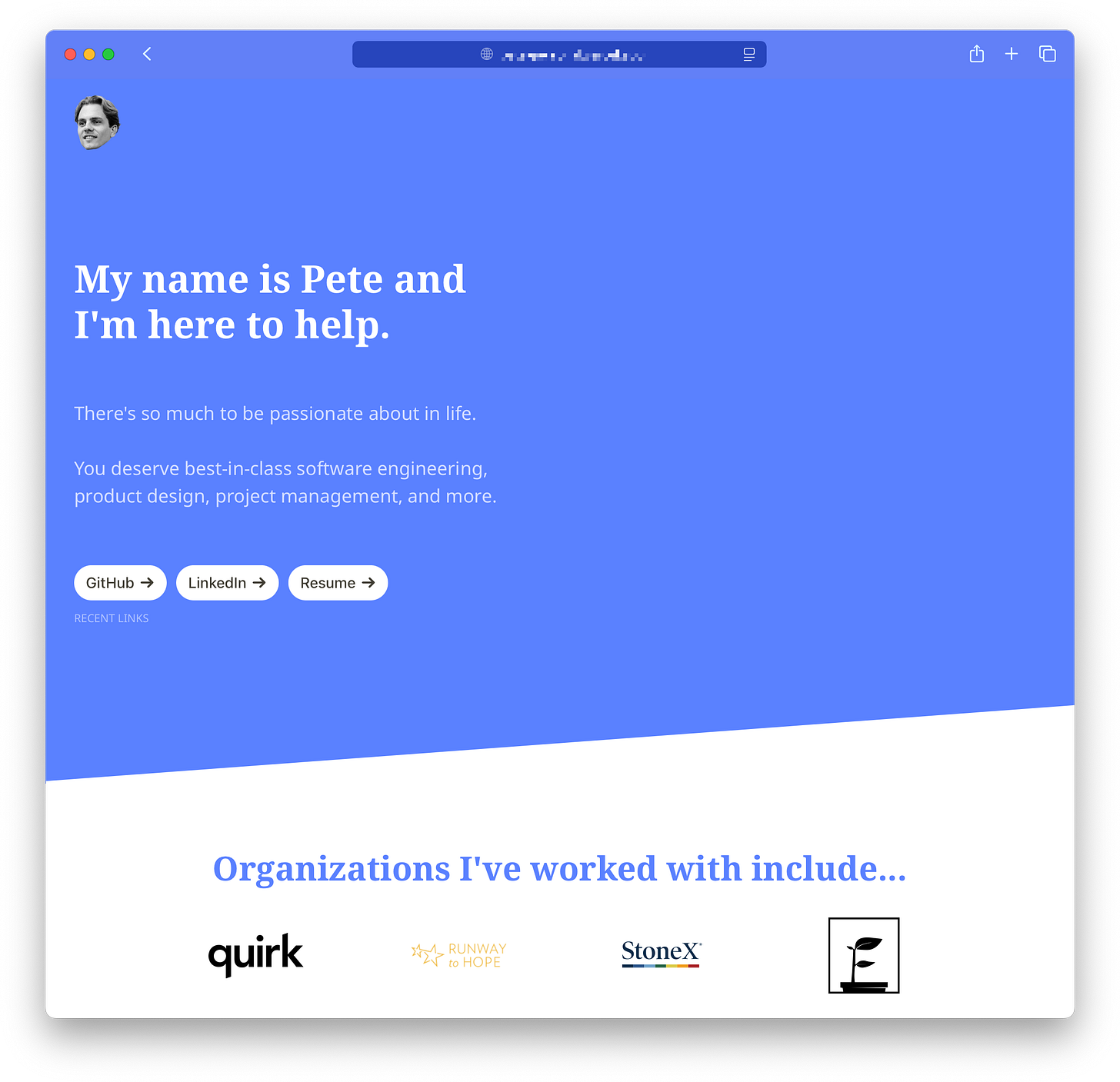 From the get-go, I was confident about ditching the standard header/footer layout, requiring people to click around and jump from page to page (yawn). It was important to me to constrain this to one page that would bubble up details relevant to the user immediately. I am always dying for an excuse to leverage LLMs in some novel way. The curious thought kept encircling me: what if I could have bespoke, personalized experiences for visitors? As inputs, I thought using document.referrer, an old-school JavaScript feature, would be neat for instances where we could infer the visitor, perhaps an organization, from the URI. I still think some confluence of inputs like this could be enough for a general clue, but I wanted to get hyper-specific, even if this meant some manual labor for the time being. After some thought, I settled on using links (websites describing the visitor) as an input for this initial version.