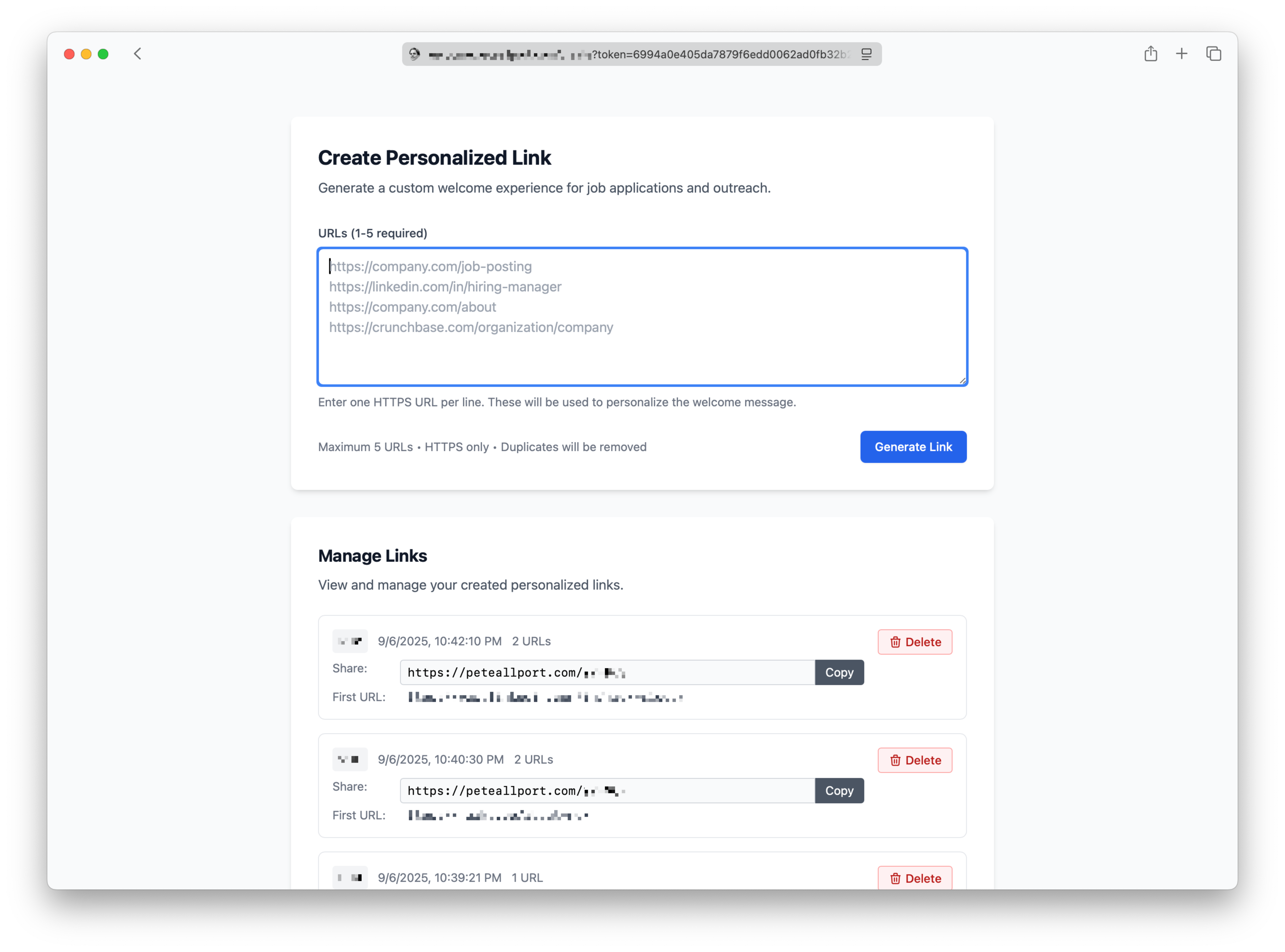 So the workflow is still pretty straightforward. On the admin page, I plop a few links about the individual (and/or company, job posting, or whatever), and hit that Generate Link button. Which returns a personalized peteallport.com link with a slug that I can use anywhere.