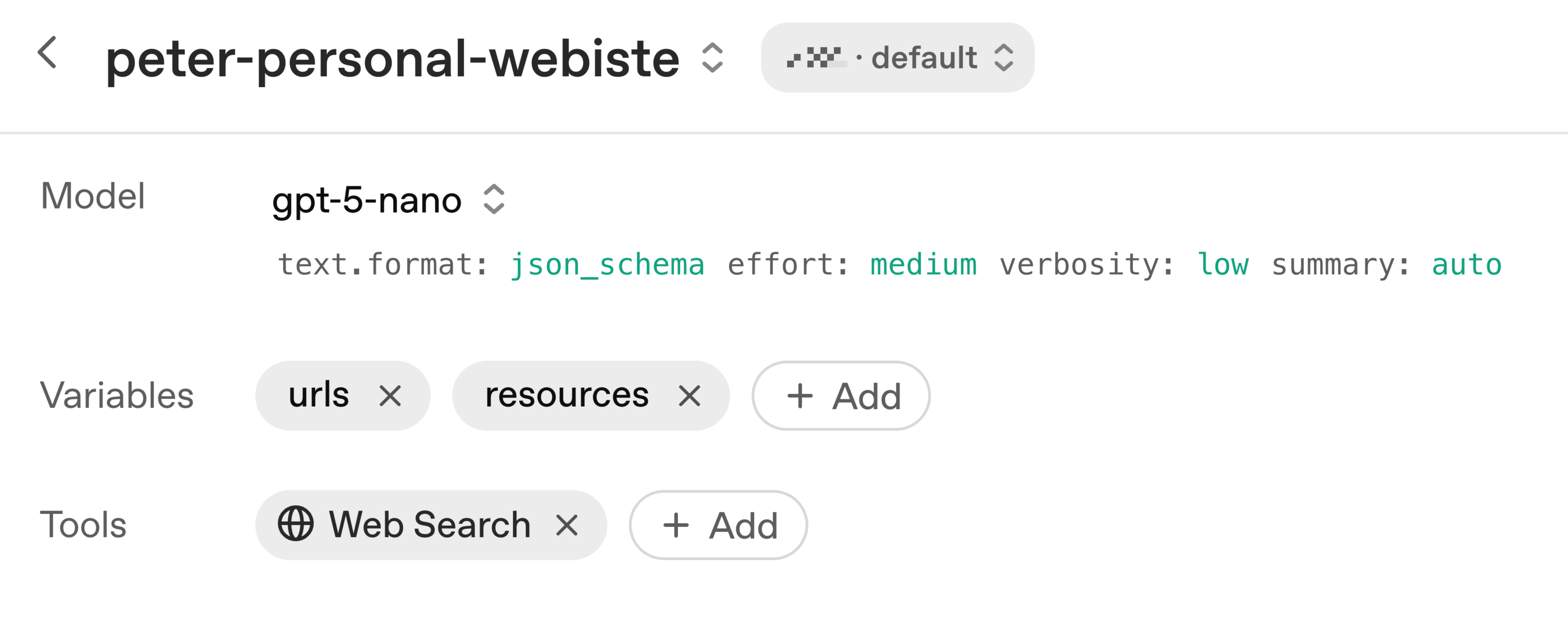 As for the actual inference, I opted for gpt-5-nano which is surprisingly fast for the output quality you get. I had originally developed a custom MCP server with a tool suppling the JSON resources (links) about me, but this proved somewhat overkill and I ran into several known bugs with Responses API using custom MCPs. Consequently, I am using the below configuration. This simply includes prompt inputs (visitor URLs and JSON resources about me) as well as JSON schema structured outputs, and the web search tool . The client (peteallport.com) also uses the same JSON resources, so this approach ensures I have a single, version-controlled source of truth that I can continually add to.