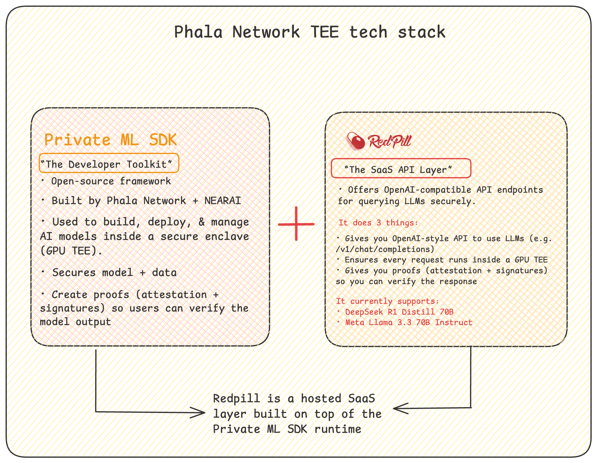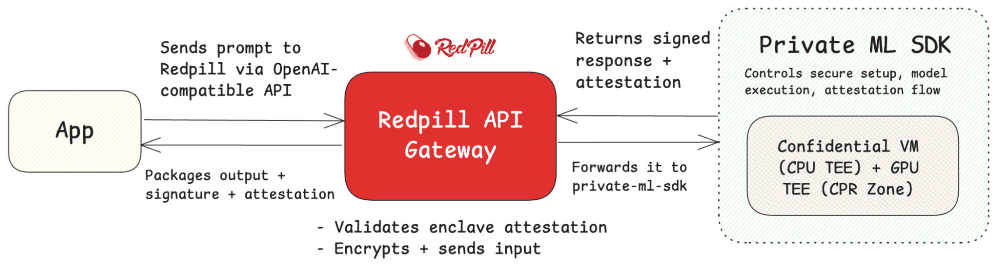 Phala Network’s GPU TEE infrastructure is built around two core components: Redpill and the private-ml-sdk. Together, they offer a complete solution for running AI workloads like LLM inference in a verifiable, secure, and isolated hardware environment.