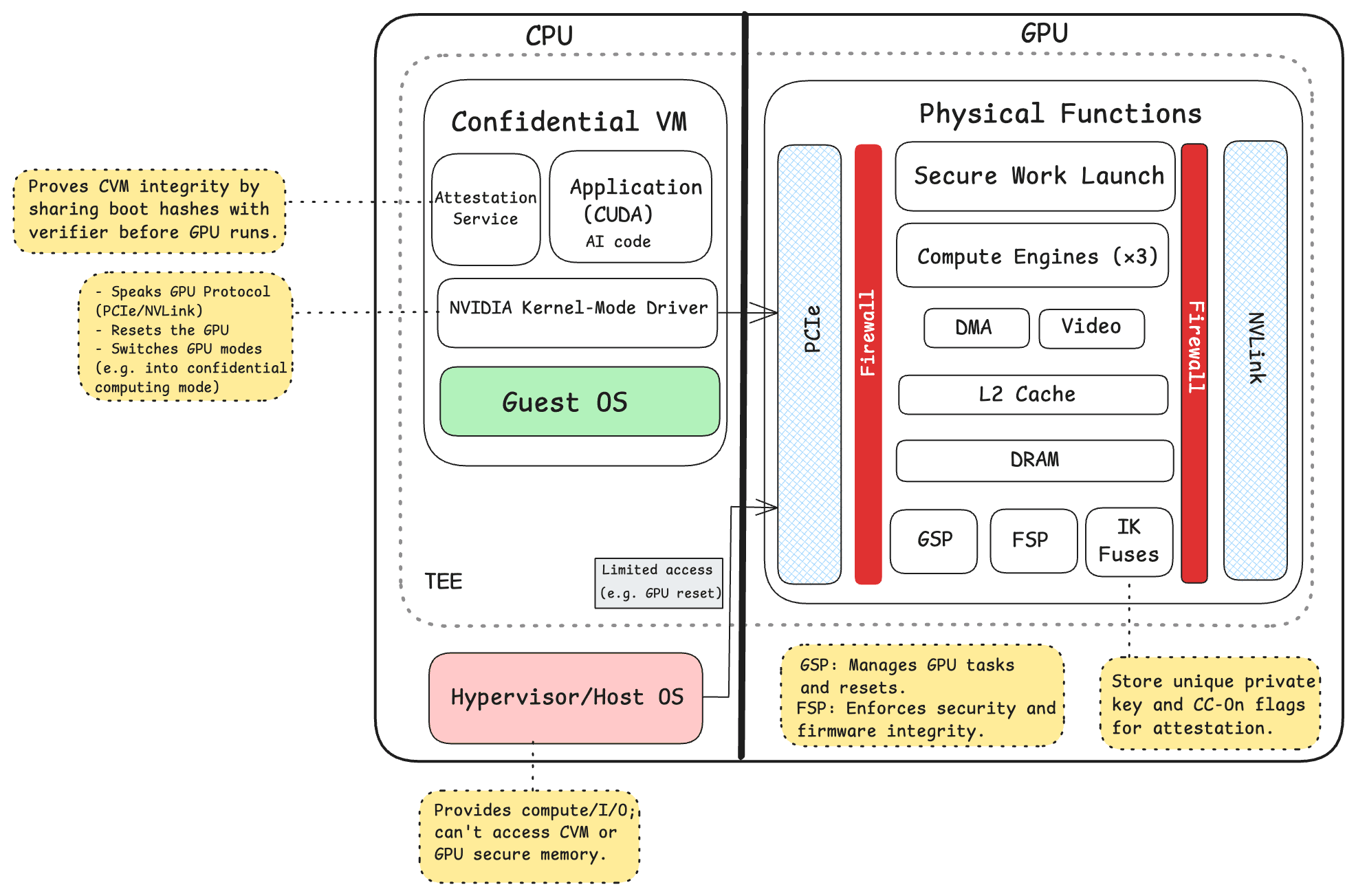 - Layered Security: CPU TEEs (Intel TDX or AMD SEV-SNP) launch a Confidential VM that exchanges encrypted data with the GPU enclave, creating a full CPU-to-GPU trust chain.
