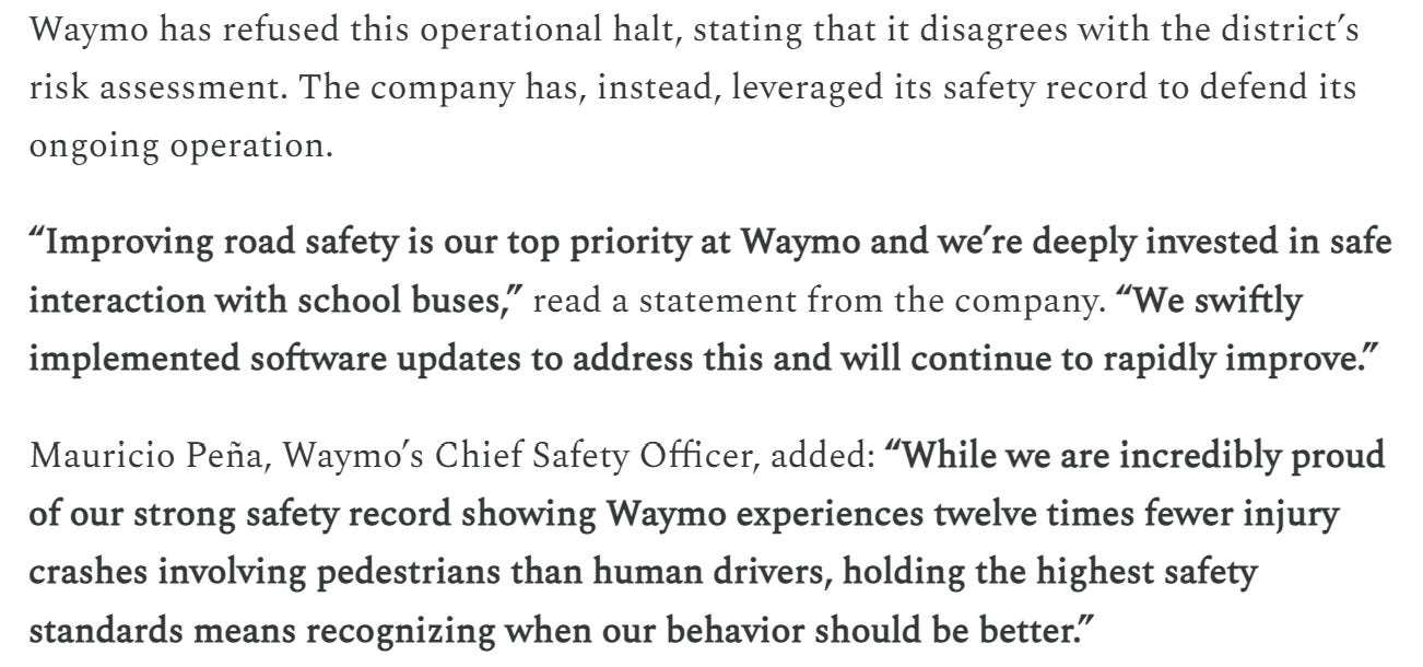 The reason they gave (per the referenced article) for not standing down problematic operations amounts to a position that Waymo has the right to unilaterally decide what risks it takes with the safety of children. But apparently if you make enough of a stink they will give fixing it another try.