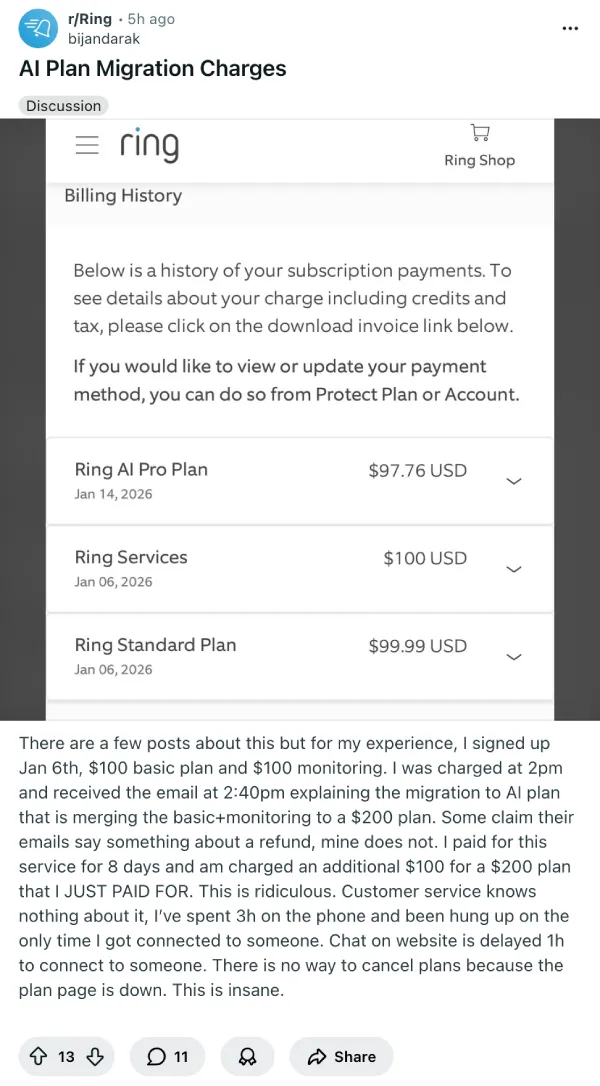 Reddit’s r/Ring community lit up with frustrated customers reporting prorated charges they never authorized. One user posted about a $63.50 charge, writing, “I can’t get through to support on phone or chat.” Another user said they were hit with a $92 charge despite already paying $216 for a full year of service just two months earlier. The common thread? Ring apparently migrated existing subscriptions to a new plan structure without giving customers advance notice about the changes to their accounts.