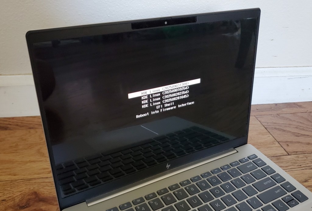 For example, KDE Linux preserves the last few OS images on disk, automatically. Get a bad build? Simply roll back to the prior one! It’s as easy as pie too; they show up right there on the boot menu: