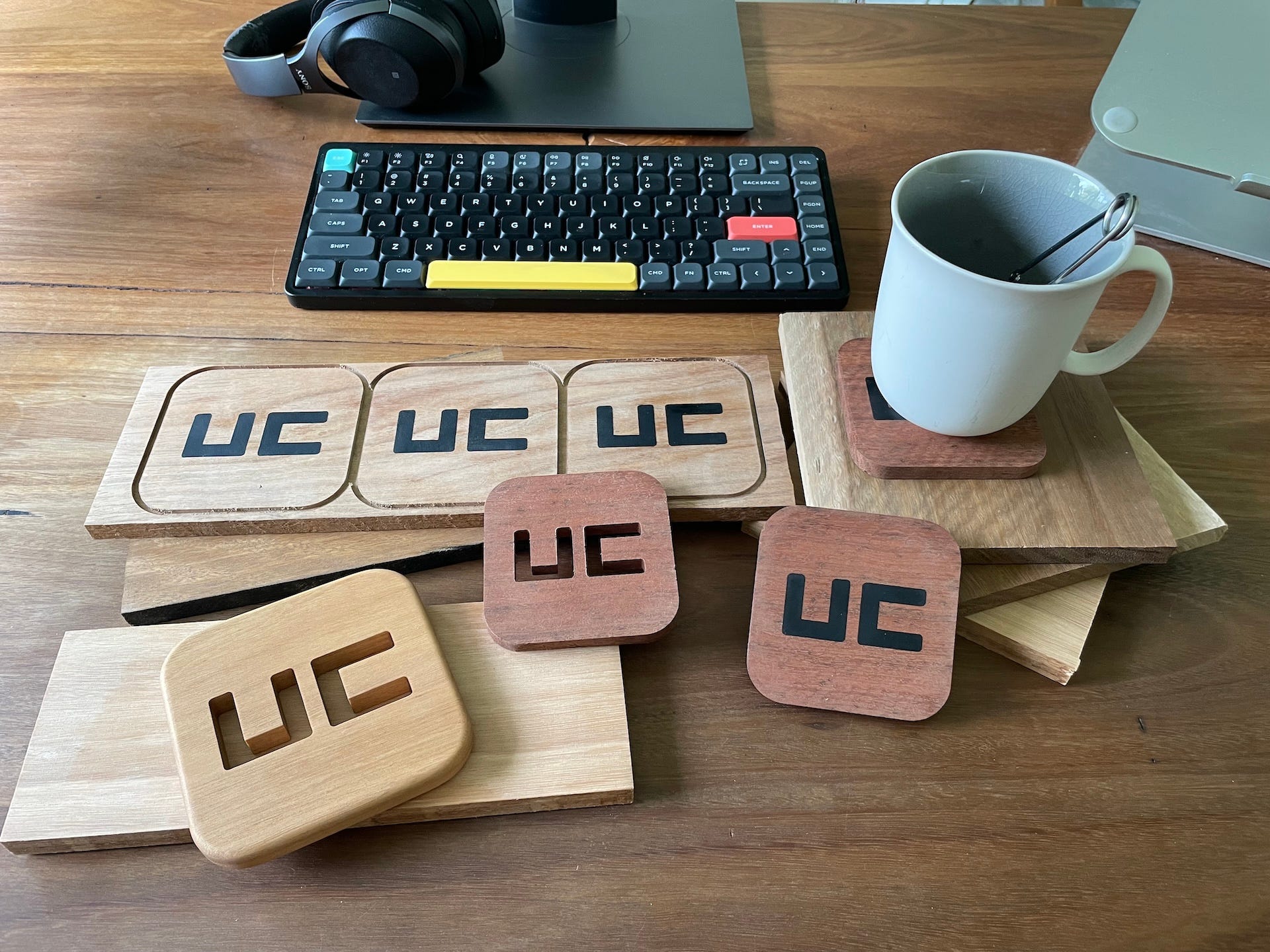I’ve been experimenting with making wooden coasters with the Uncloud (uc) logo from recycled Australian timber (mainly eucalypts). If you want one: