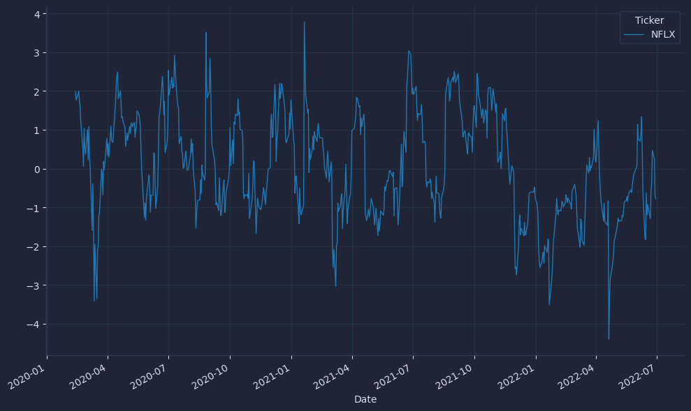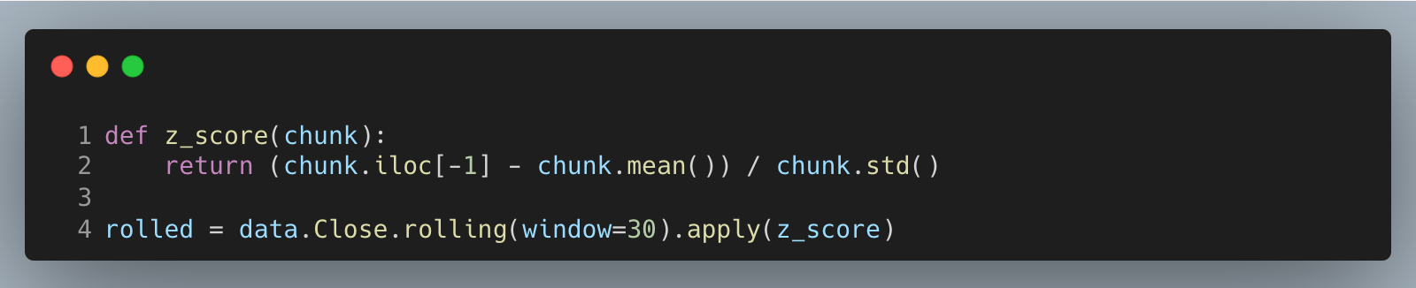 This yields a standardized feature where larger positive values mean the price sits above its recent mean by more local volatility. For backtests, join this feature to returns with a one-bar lag to avoid lookahead bias; we compute on bar t but must act on bar t+1. .apply makes the per-window logic explicit for learning, while vectorized rolling means/std are faster in production.