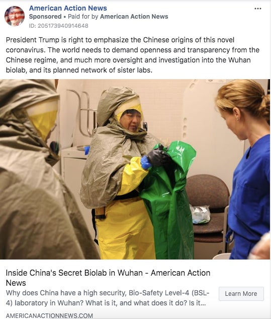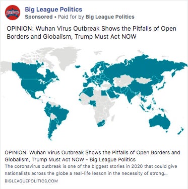 Anti-globalists are able to easily weave toxic language into their rhetoric as well. In a Facebook group specifically dedicated to the pandemic, someone wrote: “WHO is owned by the Chinese, don’t believe them.” Big League Politics is a pro-Trump website founded by former Breitbart staffers, and ran this ad on Facebook: