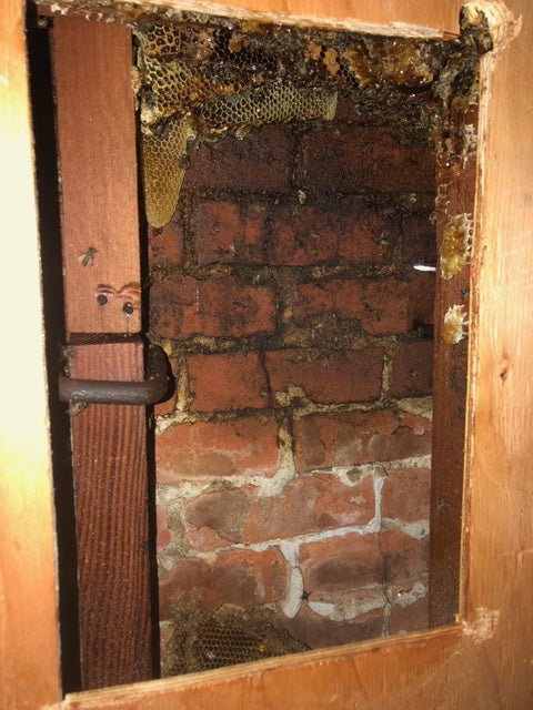 Using a thermal imaging camera, Super Bee’s technician located the bee colony nested between the building’s second and third floors. “So they cut a hole in the ceiling and she had to shimmy up between the floors,” McPherson says. It took the better part of a day for Super Bee to attract the bees into a box, using the scent of a queen bee to lure them in.
