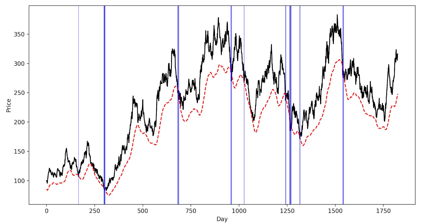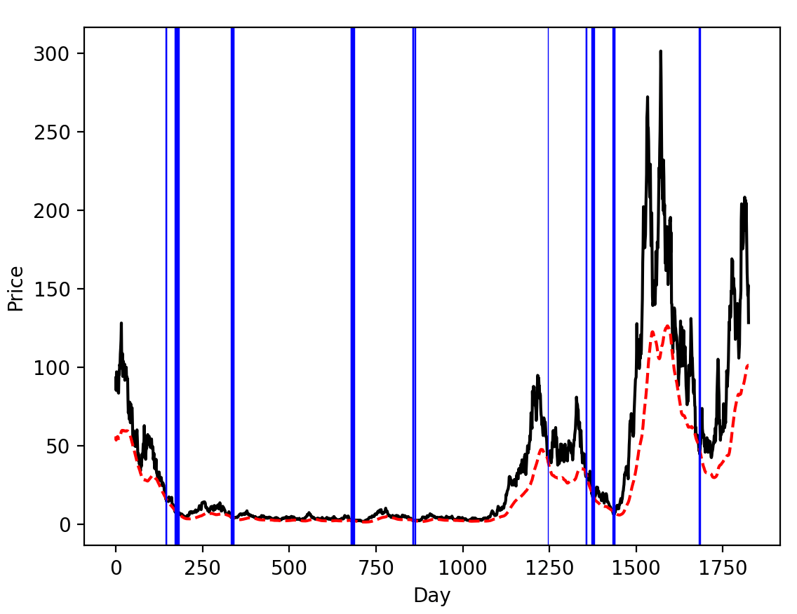 The 85% threshold is a little more interesting. The below visual helps explain what’s going on. The black line shows the asset price on a day, and the dotted red line shows the discounted price the dip-buyer is waiting for. Every blue line shows a day that the dip-buyer bought.