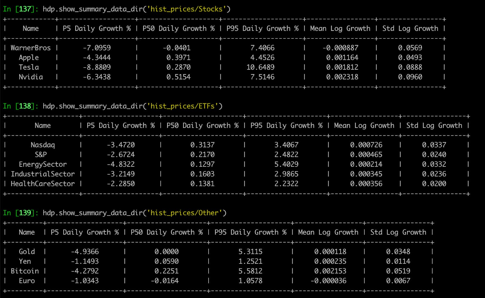 The first three columns show the % that the prices tend to move (the 5th, 50th, and 95th percentiles, to give a sense of the breadth). The last two columns are the mean and std dev for the logarithms of the daily percent changes. These are useful for constructing a model for geometric Brownian motion, and is what the simulation actually uses, but they’re not that helpful to look at. The % growth numbers give a better intuitive understanding of the growth pattern.