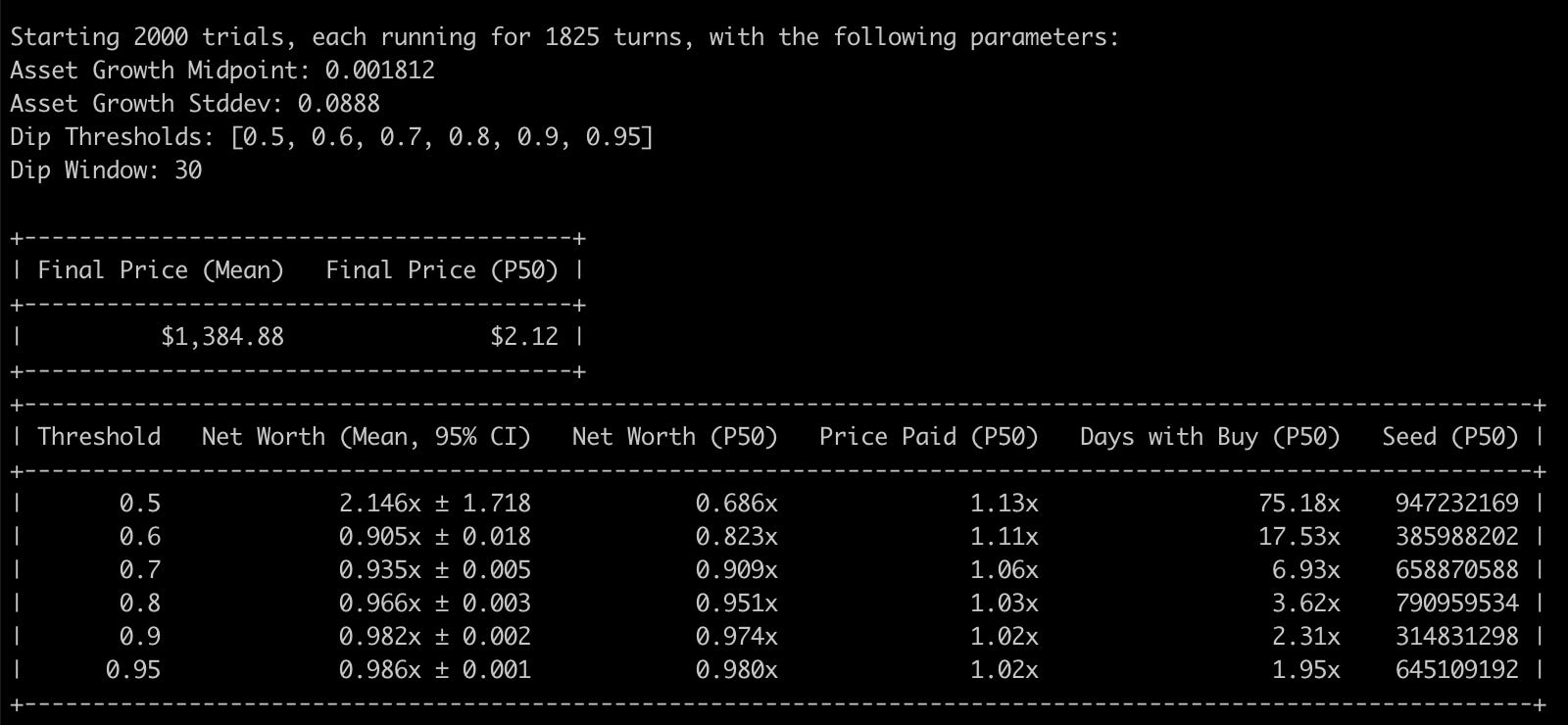 The columns show ratios between metrics for Reg Buyer vs Dip Buyer — numbers above one indicate that Reg Buyer’s metric was higher than Dip Buyer’s, and numbers below one indicate the opposite.6 The most important metric is the net worth the bots end the simulation with, but it’s also interesting to see how much higher the reg buyer’s average price paid was, and how many days it bought.