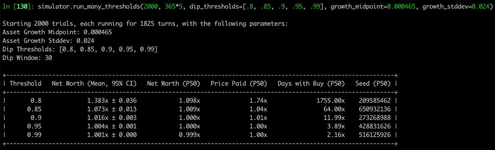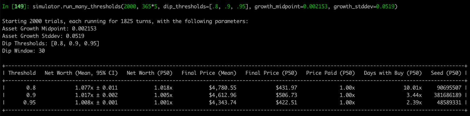 Each row here shows the results of 2,000 trials, where our reg buyer bought every day and our dip buyer waited for the price to dip to the threshold on the left (0.8 means 80% of the average price, 0.9 means 90%, etc).
