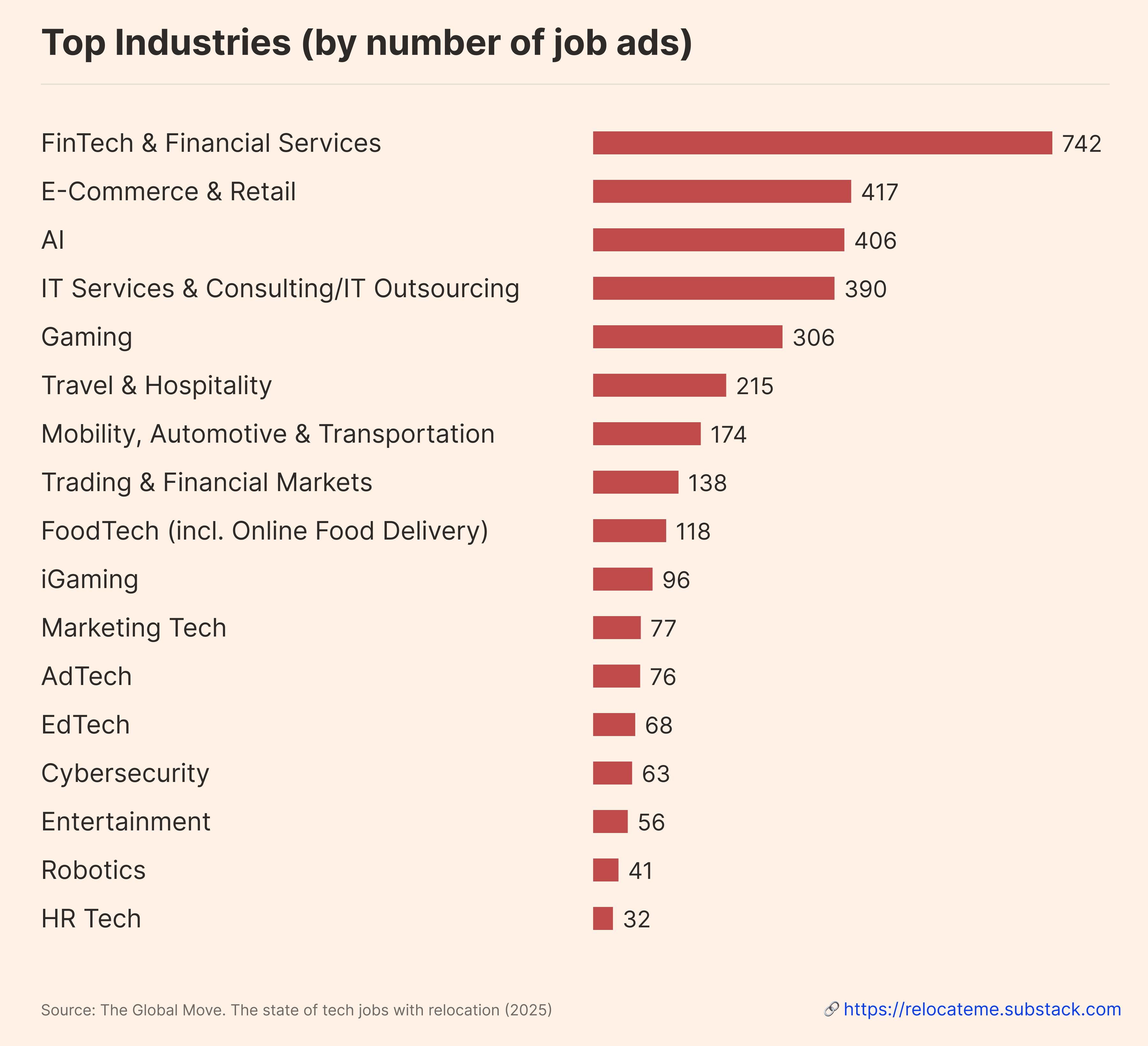 IT Services & Consulting (390), Gaming (306), and Travel & Hospitality (215) also hire actively. Gaming’s presence may surprise readers who remember 2024’s brutal layoffs, but studios continue to need tech folks, and the industry generated $184 billion globally in 2024. Gaming, maybe pushed by iGaming, lives on. Actually, iGaming companies, based heavily in Malta and Cyprus, consistently hire internationally due to the specialized regulatory and technical expertise required. It remains there, and the industry’s hiring hasn’t collapsed despite the headlines.