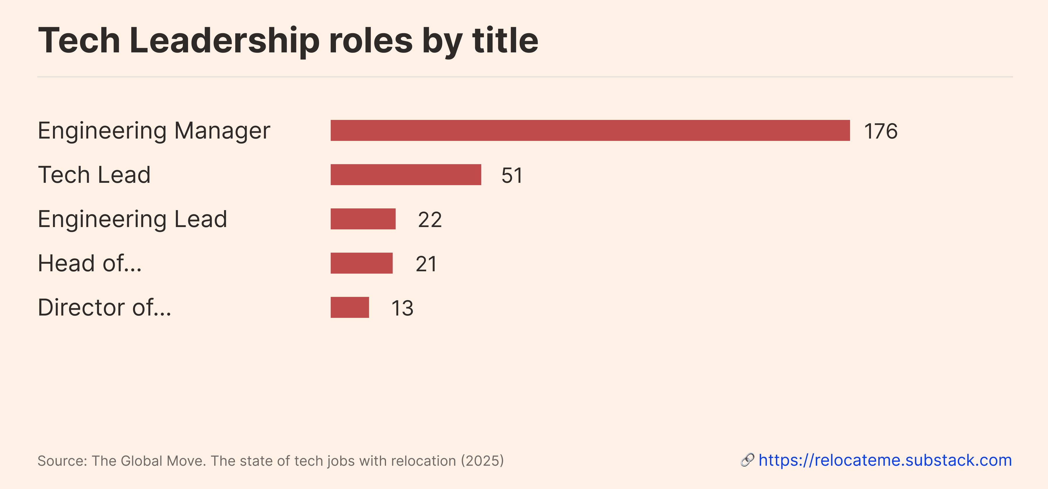 Engineering Management & Technical Leadership (405 vs. 171 previously) saw strong growth as companies seek leaders who can build and scale distributed teams. The breakdown includes 176 Engineering Manager roles, 51 Tech Lead positions, 22 Engineering Lead openings, plus senior titles like Head of Engineering (21) and Director of Engineering (13). Visas for these jobs are paid for by the companies because it’s really hard to find technical leaders who can work with people from different cultures and time zones.