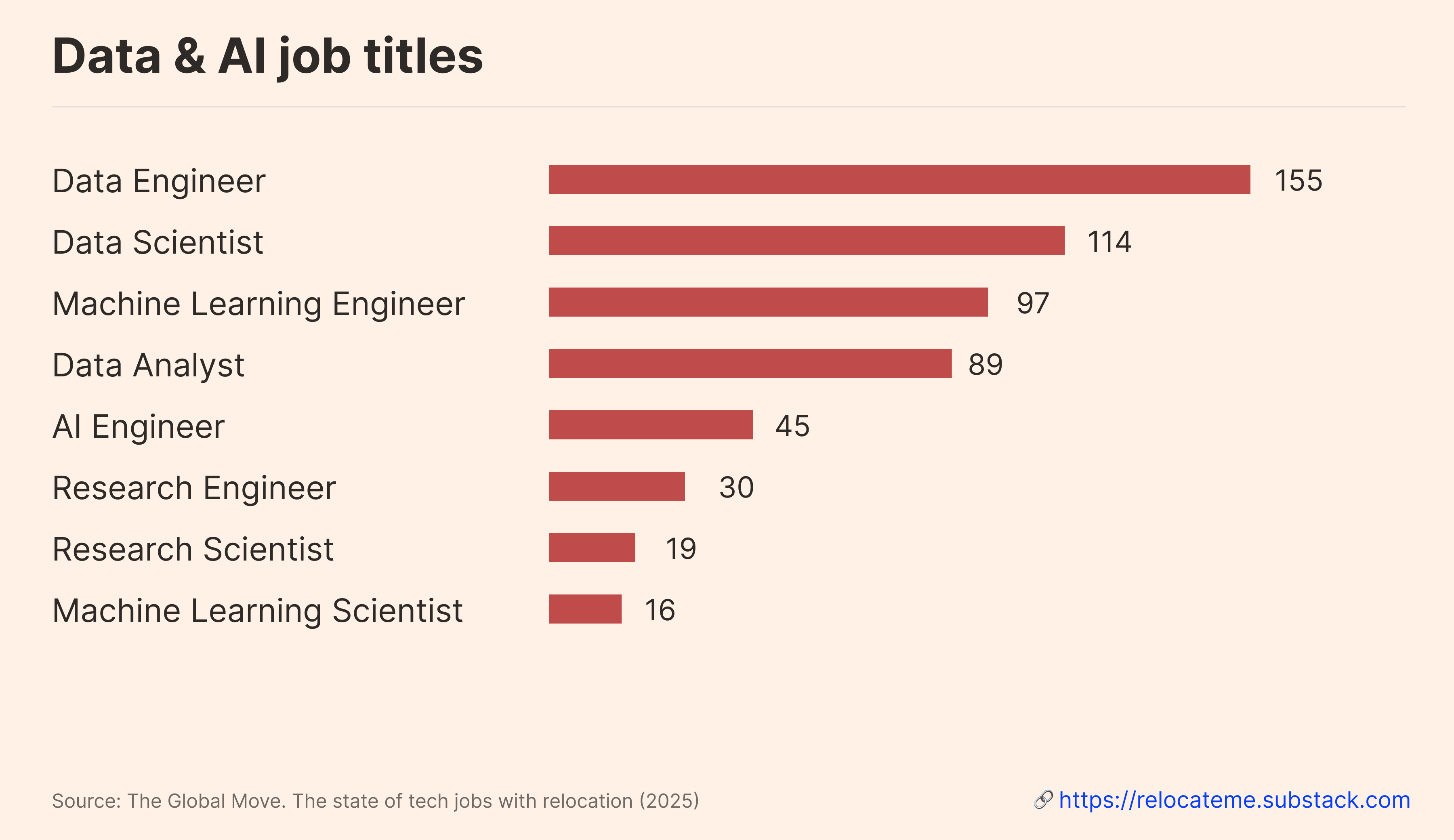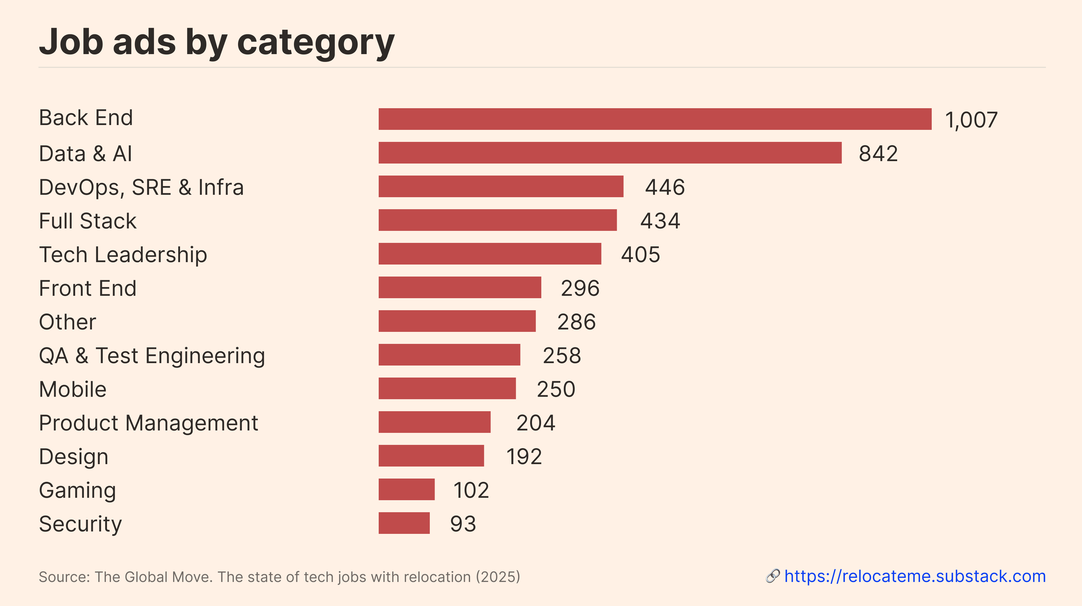 This graph shows how demand is spread out across different tech jobs by looking at nearly 4,815 job ads that offer relocation help. It’s a real-time look at where companies are looking for international tech talent.