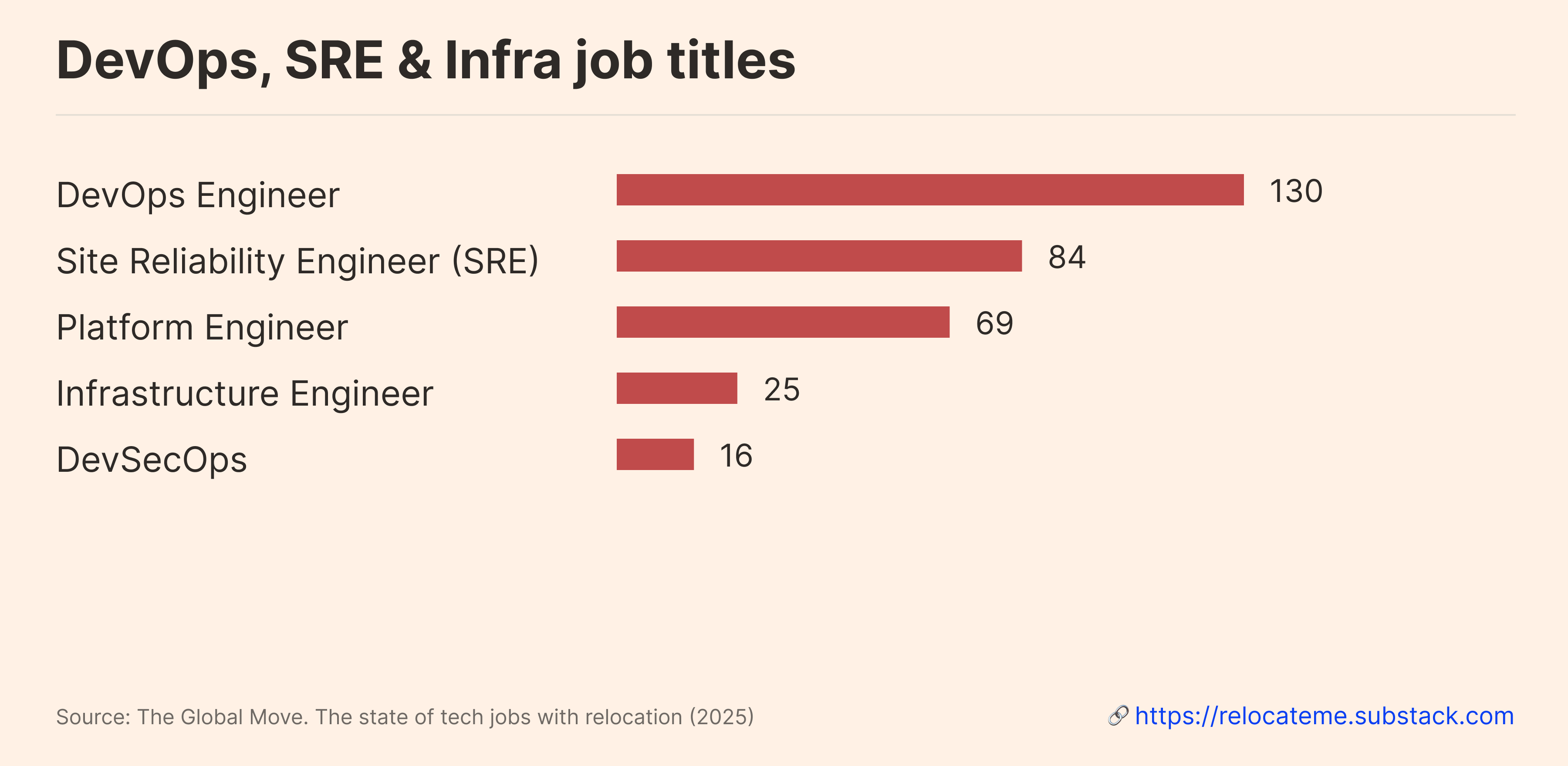 DevOps, SRE & Infrastructure holds third place at 446 openings, compared to 194 in my previous analysis. The category’s share grew slightly from 8.64% to 9.26% of total roles. DevOps Engineer (130) and Site Reliability Engineer (84) lead the subcategories, followed by Platform Engineer (69), Infrastructure Engineer (25), and DevSecOps (16). Even when businesses make their products bigger, they still need people to keep the systems running. As a whole, the industry is moving toward better tools and internal developer platforms, which is driving more companies to move experienced platform engineers when they can’t find them locally.