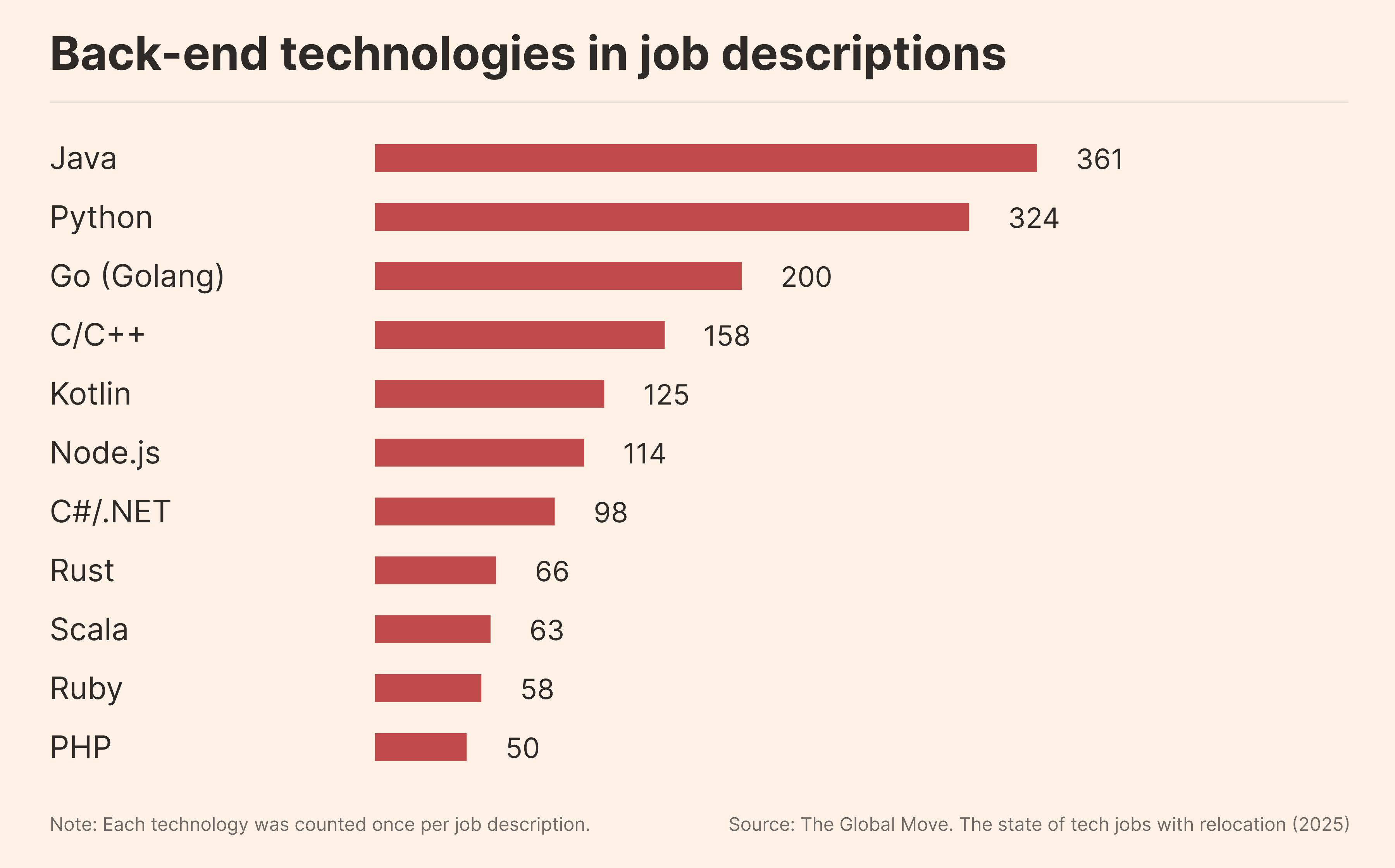 Java leads the technology mentions at 361 jobs, followed by Python (324), Go (200), C/C++ (158), and Kotlin (125). Node.js appears in 114 listings, C#/.NET in 98, Rust in 66, Scala in 63, Ruby in 58, and PHP in 50. For engineers whose skills might feel less fashionable than AI, this is reassuring. The data shows that Java and Python are still the workhorses of enterprise software.